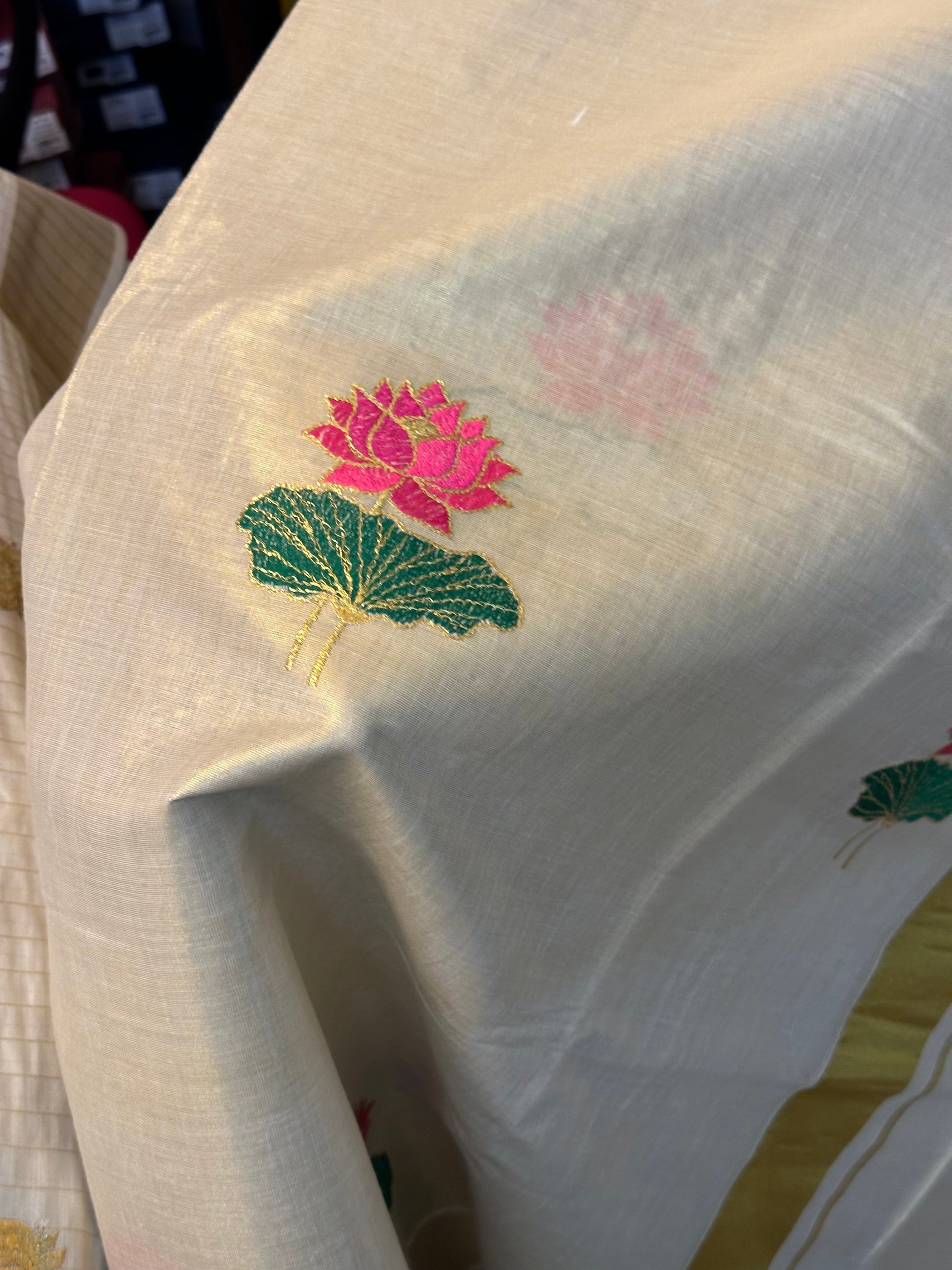Southloom Lotus Pink and Green Embroidery Tissue Kerala Saree