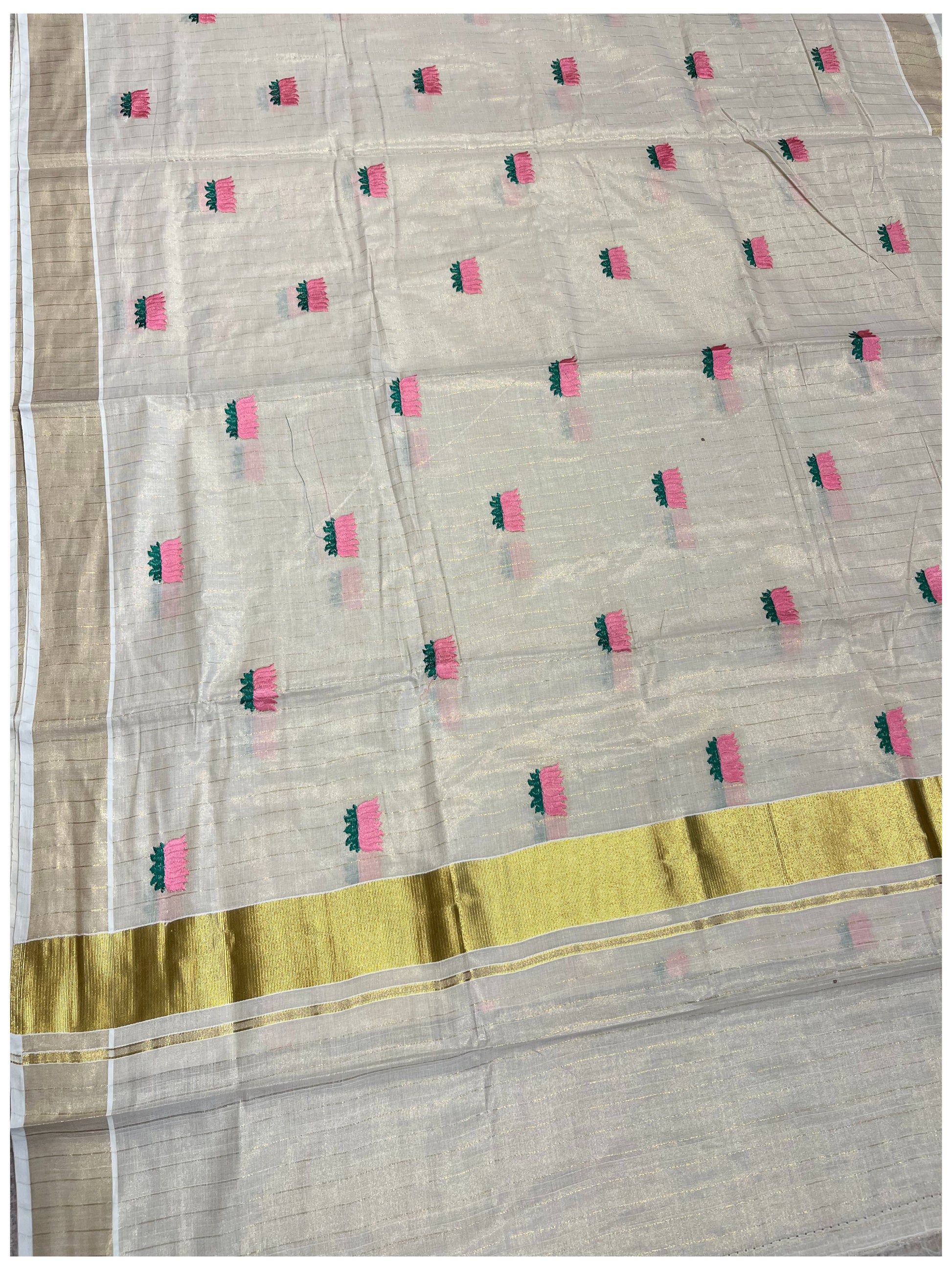 Southloom Lotus Pink and Green Embroidery Tissue Kerala Saree