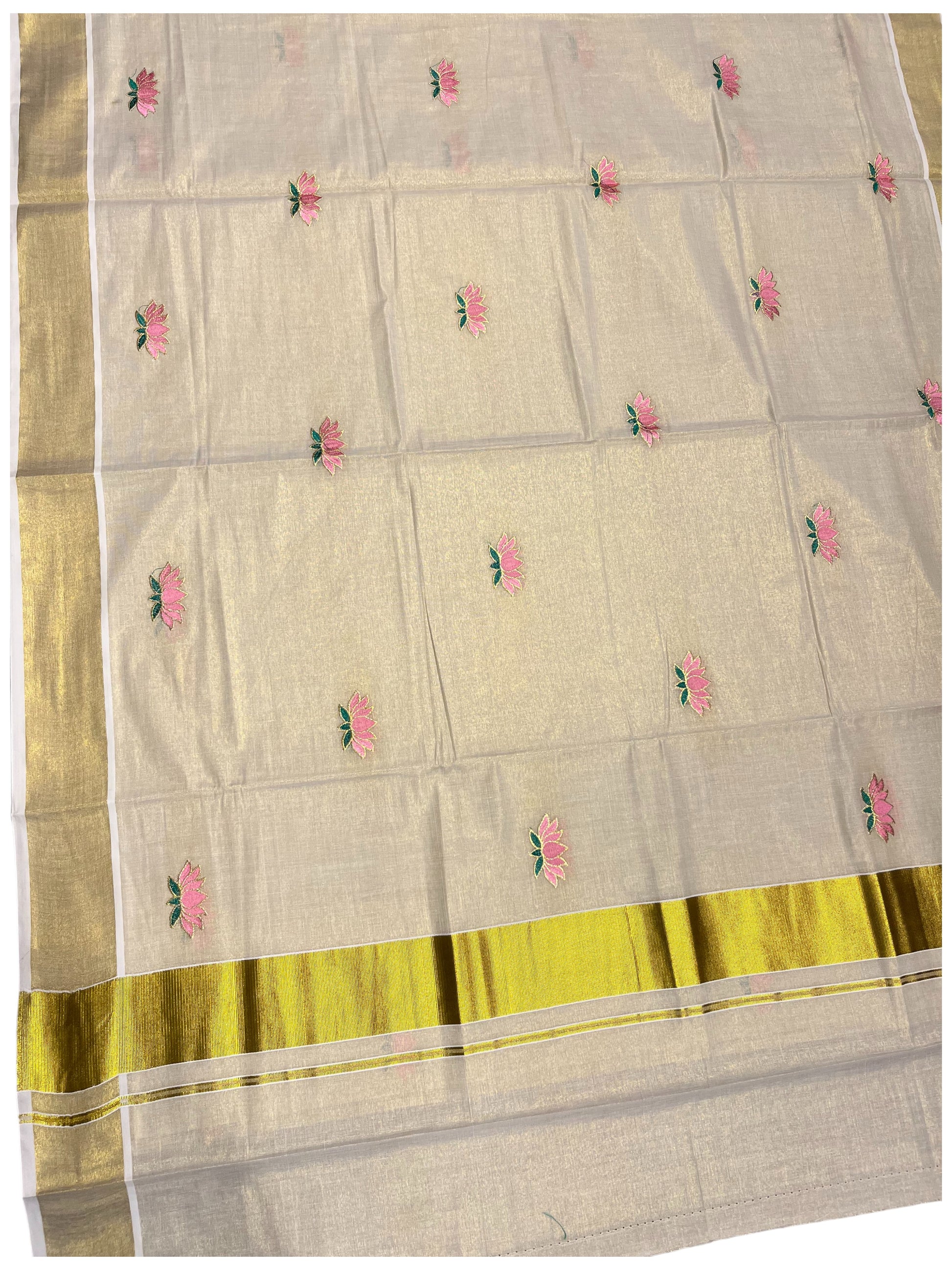 Southloom Lotus Pink and Green Embroidery Tissue Plain Kerala Saree