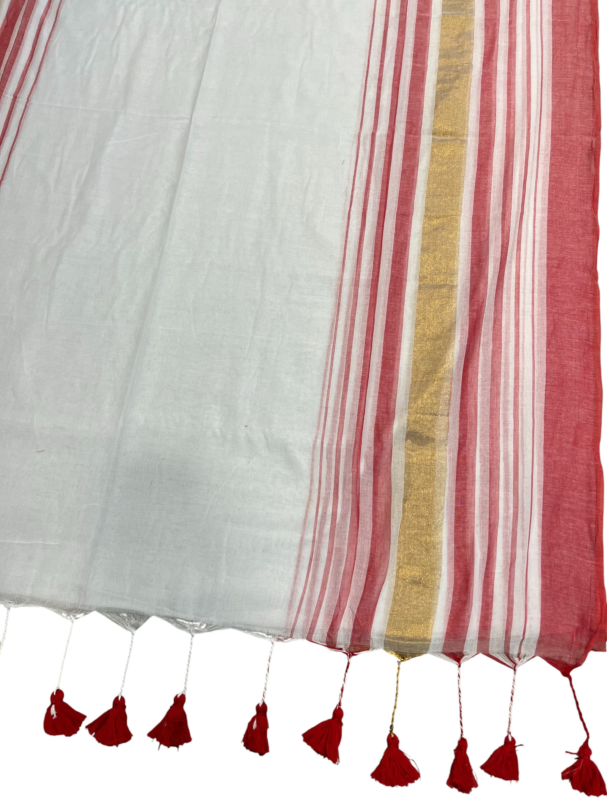 Featuring the classic Kerala saree aesthetic with a golden zari border, this piece blends tradition with understated sophistication. Ideal for both casual wear and festive gatherings, it pairs beautifully with traditional gold jewellery or modern accessories.