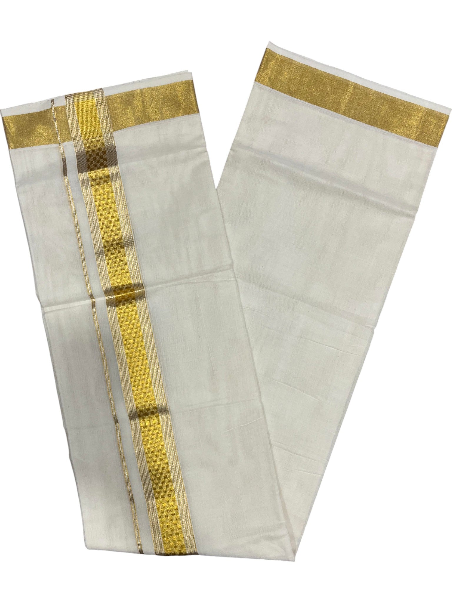 Southloom Premium Handloom Cotton Double Mundu with Gold Paaya Neythu And Silver Gold Lines Kasavu Border