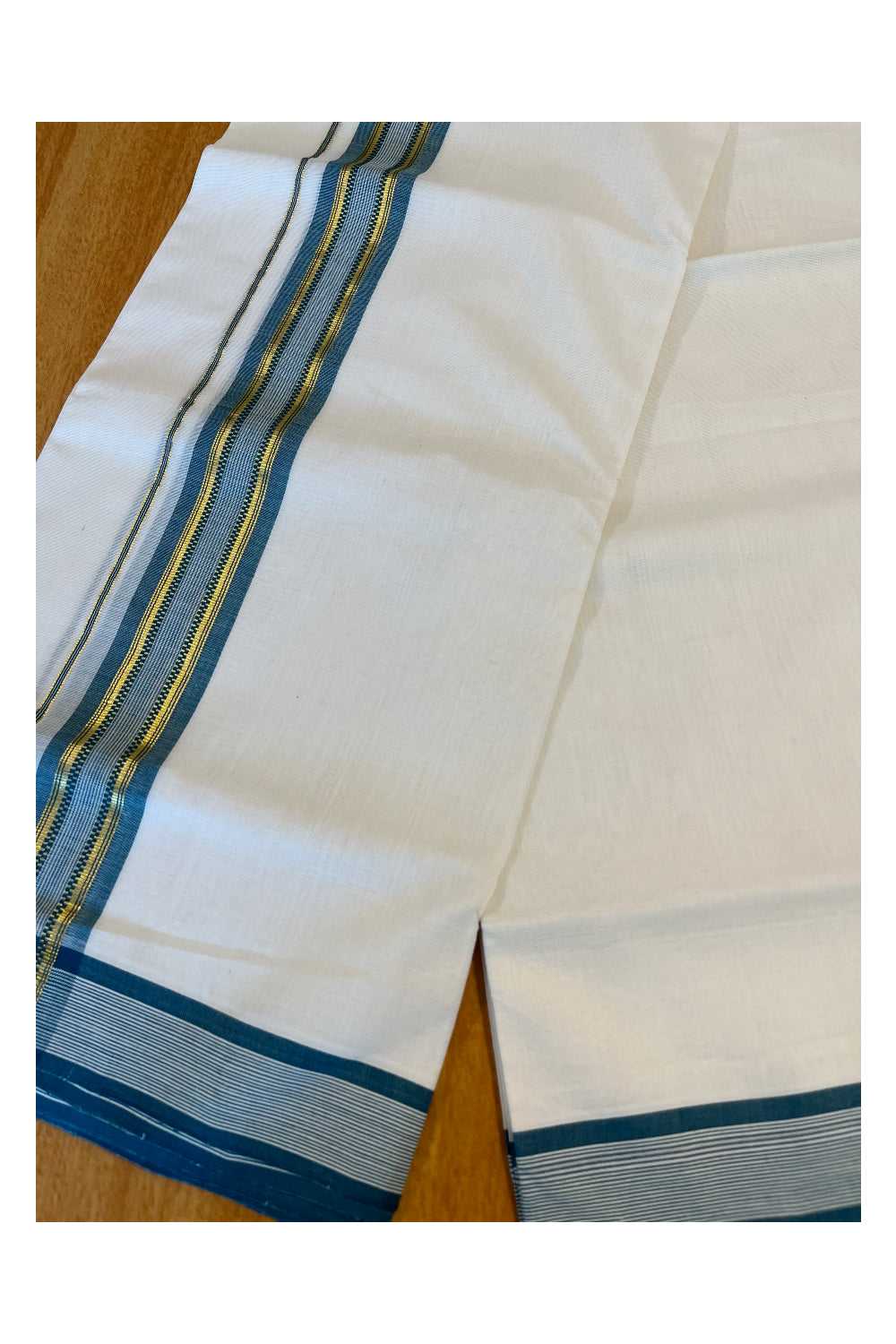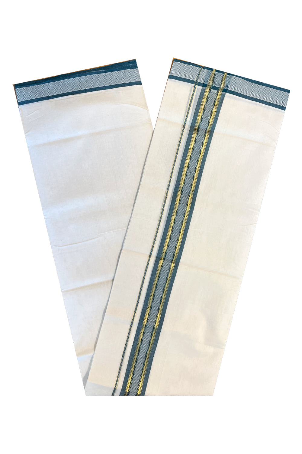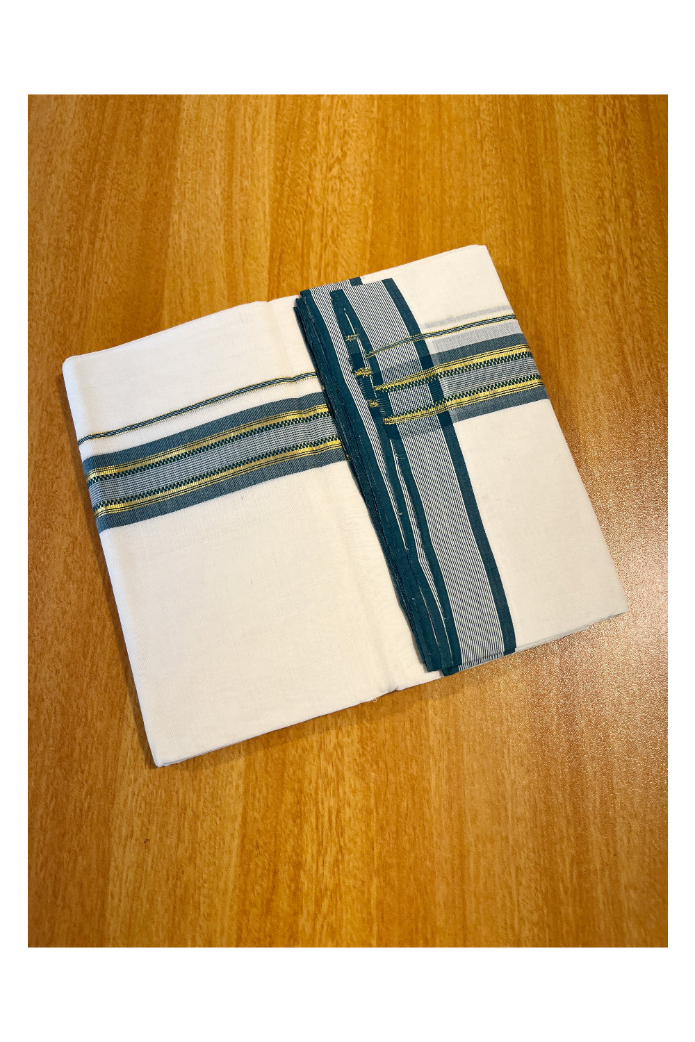 Southloom Premium Handloom Cotton Double Mundu with Kasavu And Green Lines Border