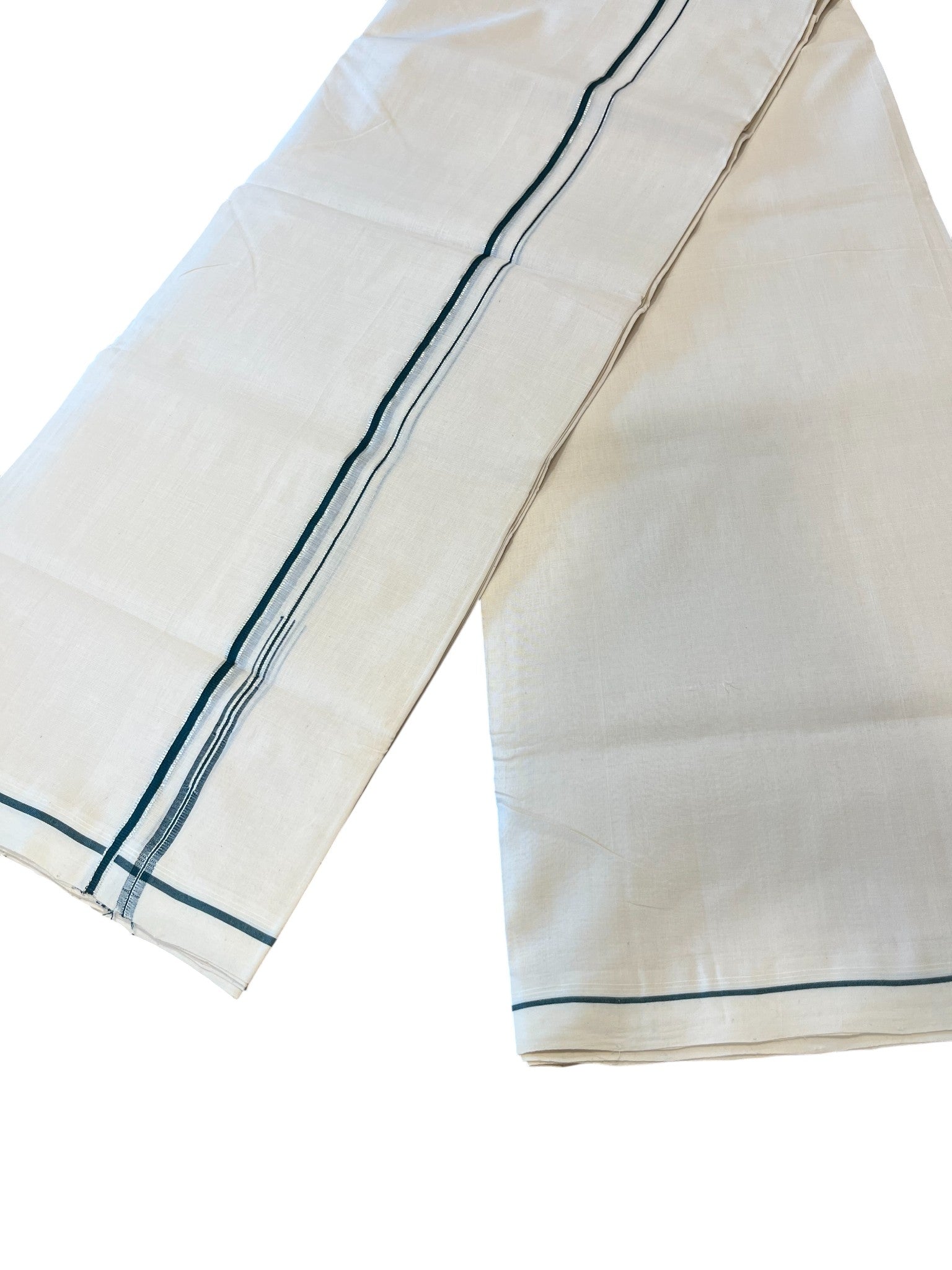 Southloom Premium Handloom Cotton Double Mundu with Silver and Green Chutti Kara Border