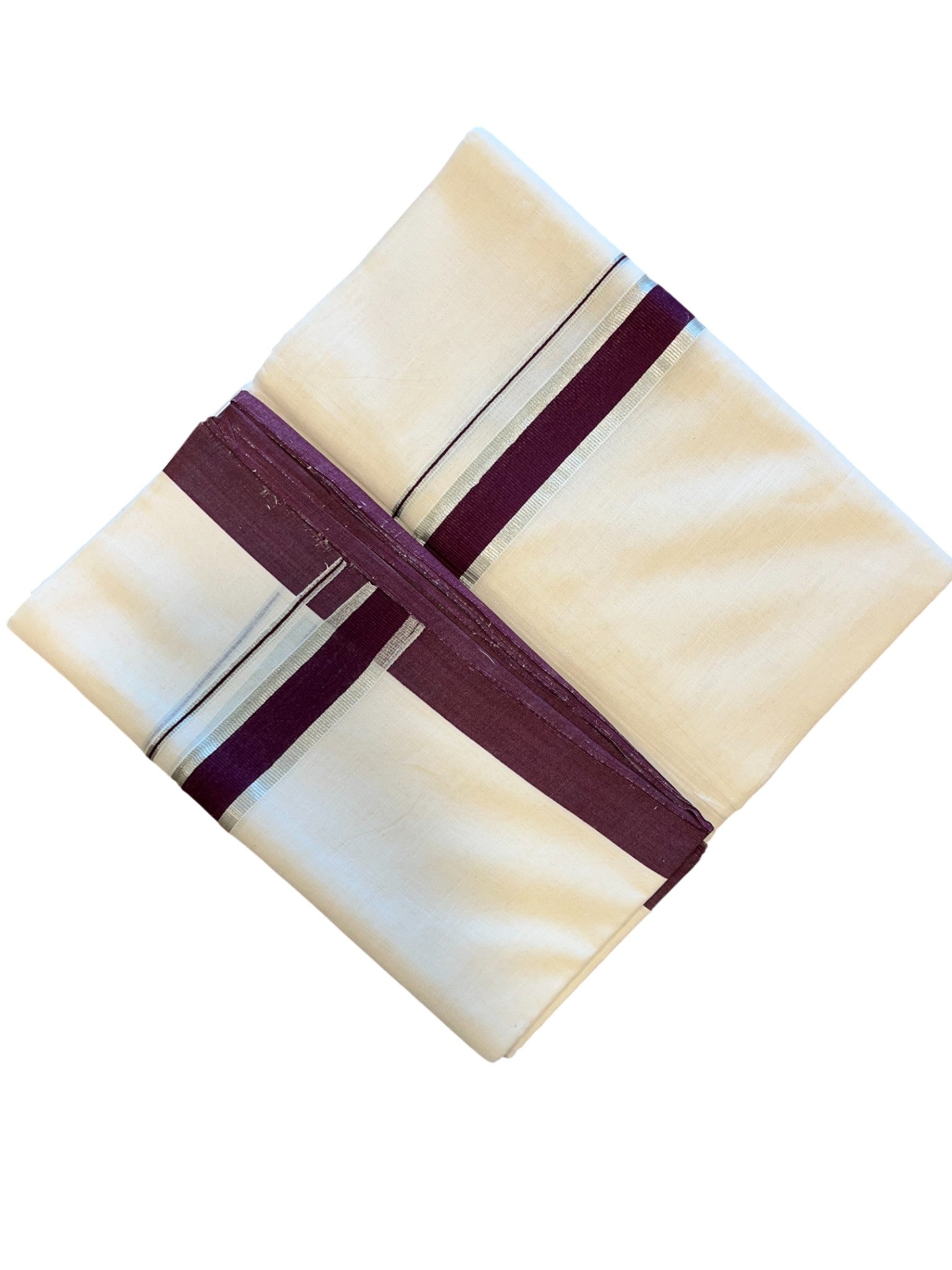 Southloom Premium Handloom Cotton Double Mundu with Silver and Purple Border