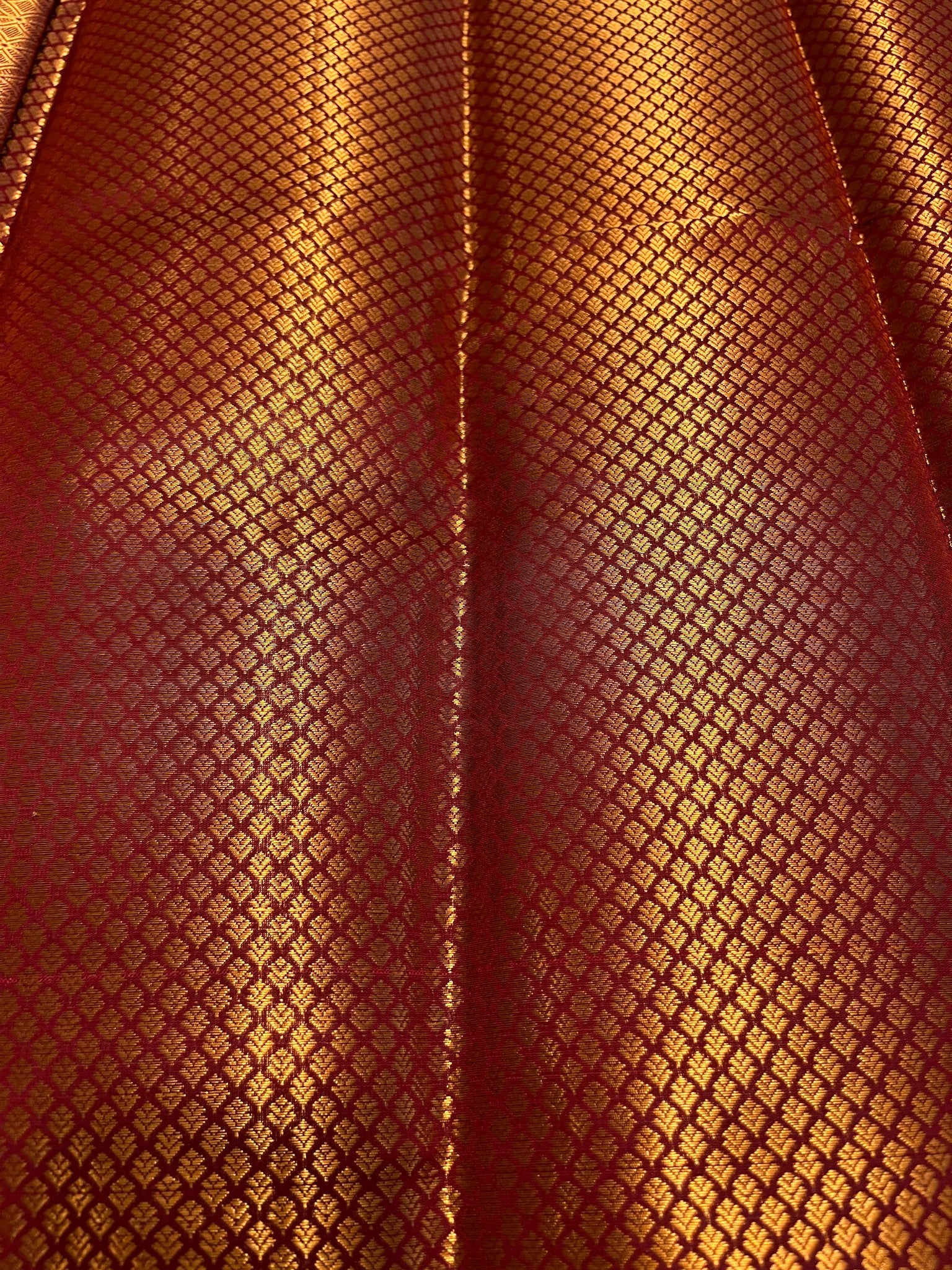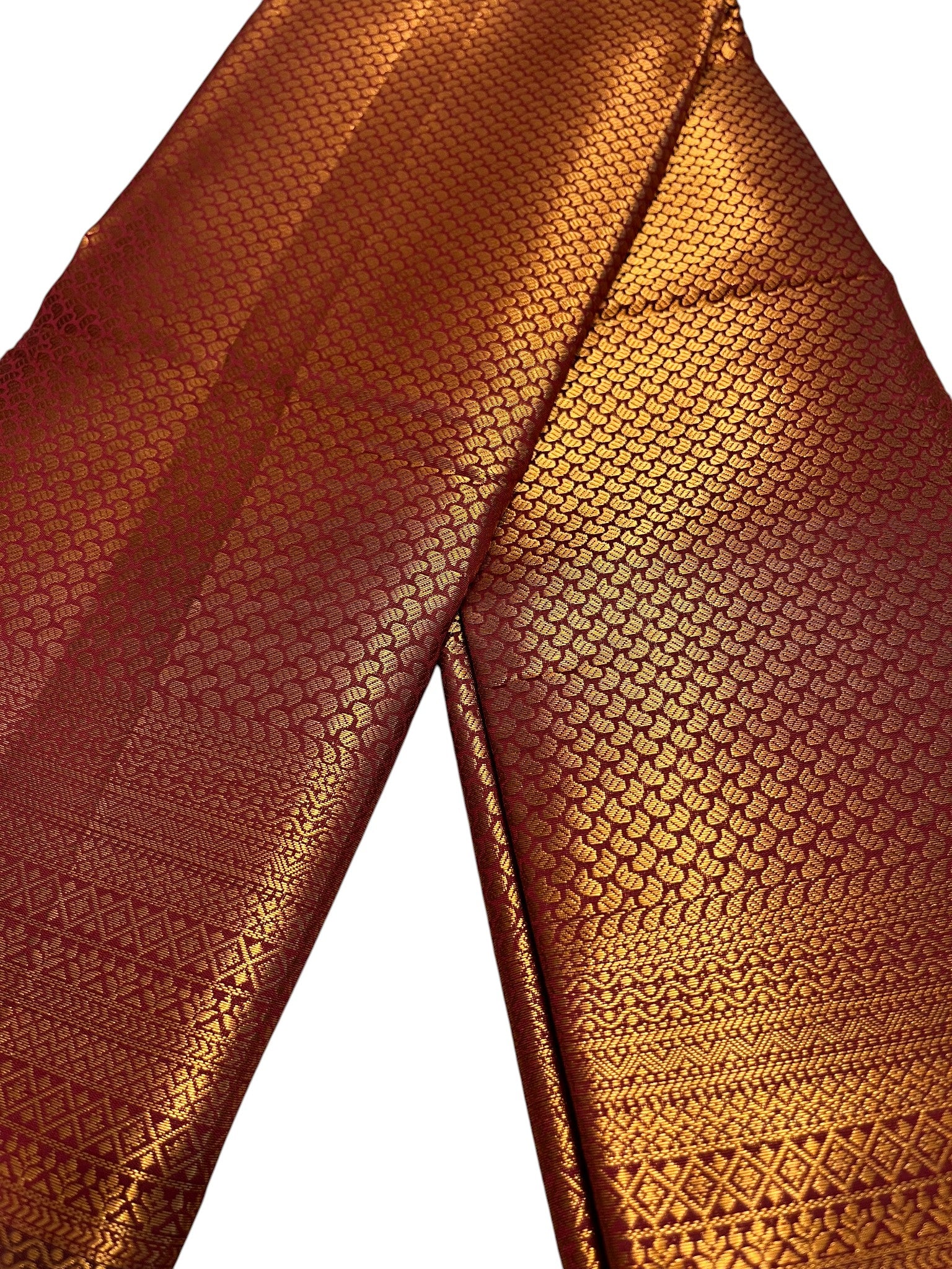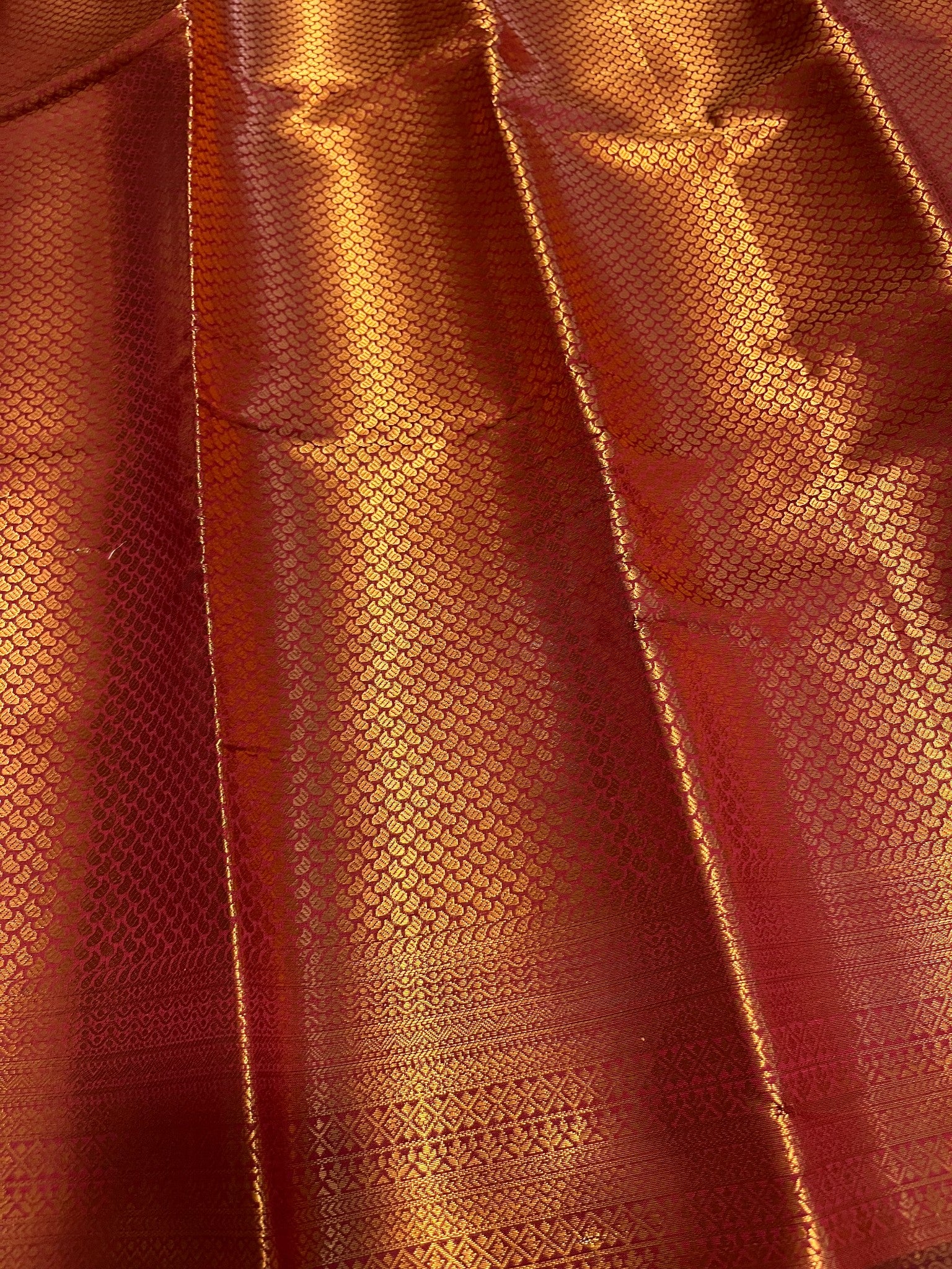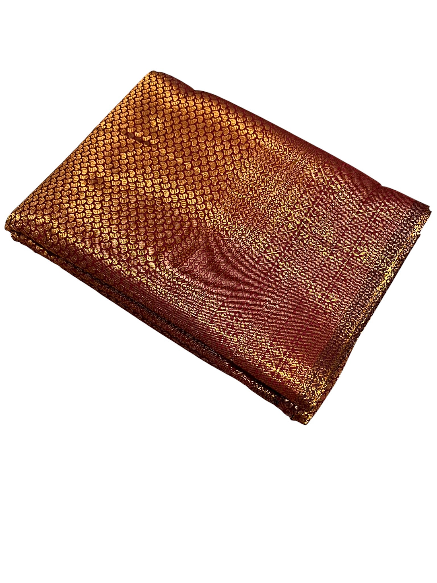 Brown with golden zari blended kanchipuram bridal silk saree crafted with intricate zari work The richly designed brocade blouse with big border adds a touch. Like every kanjivaram saree, this blended kanjivaram silk saree is too designed with heavy silk and the total saree look gives you a perfect traditional appearance for occasions and weddings.