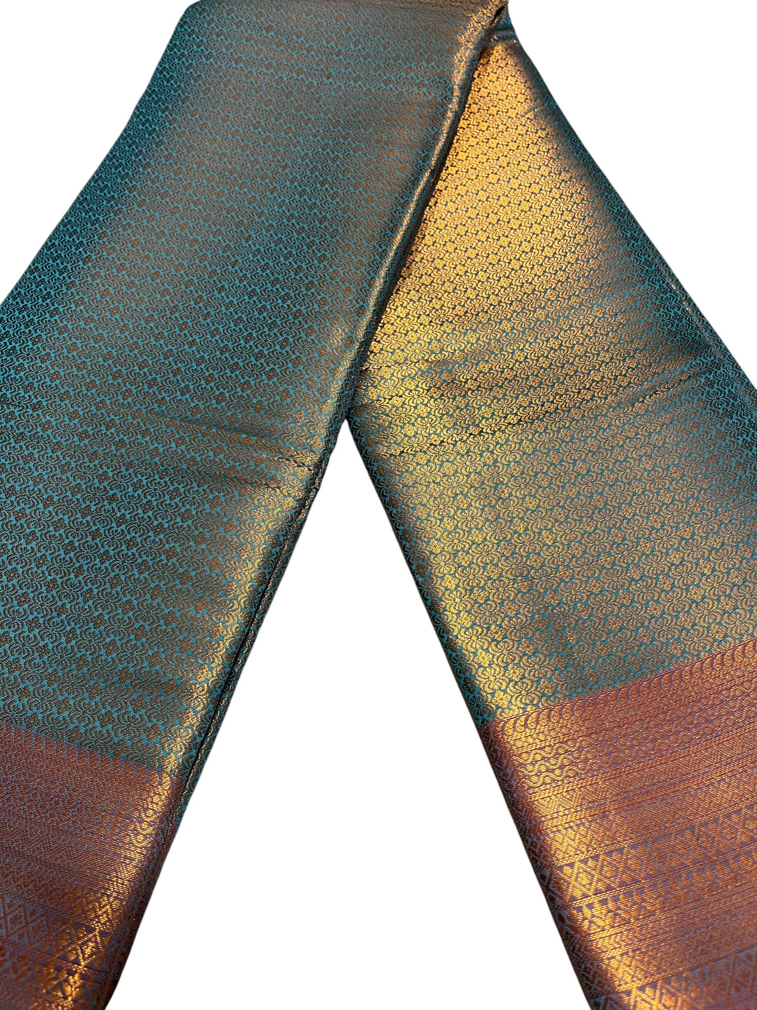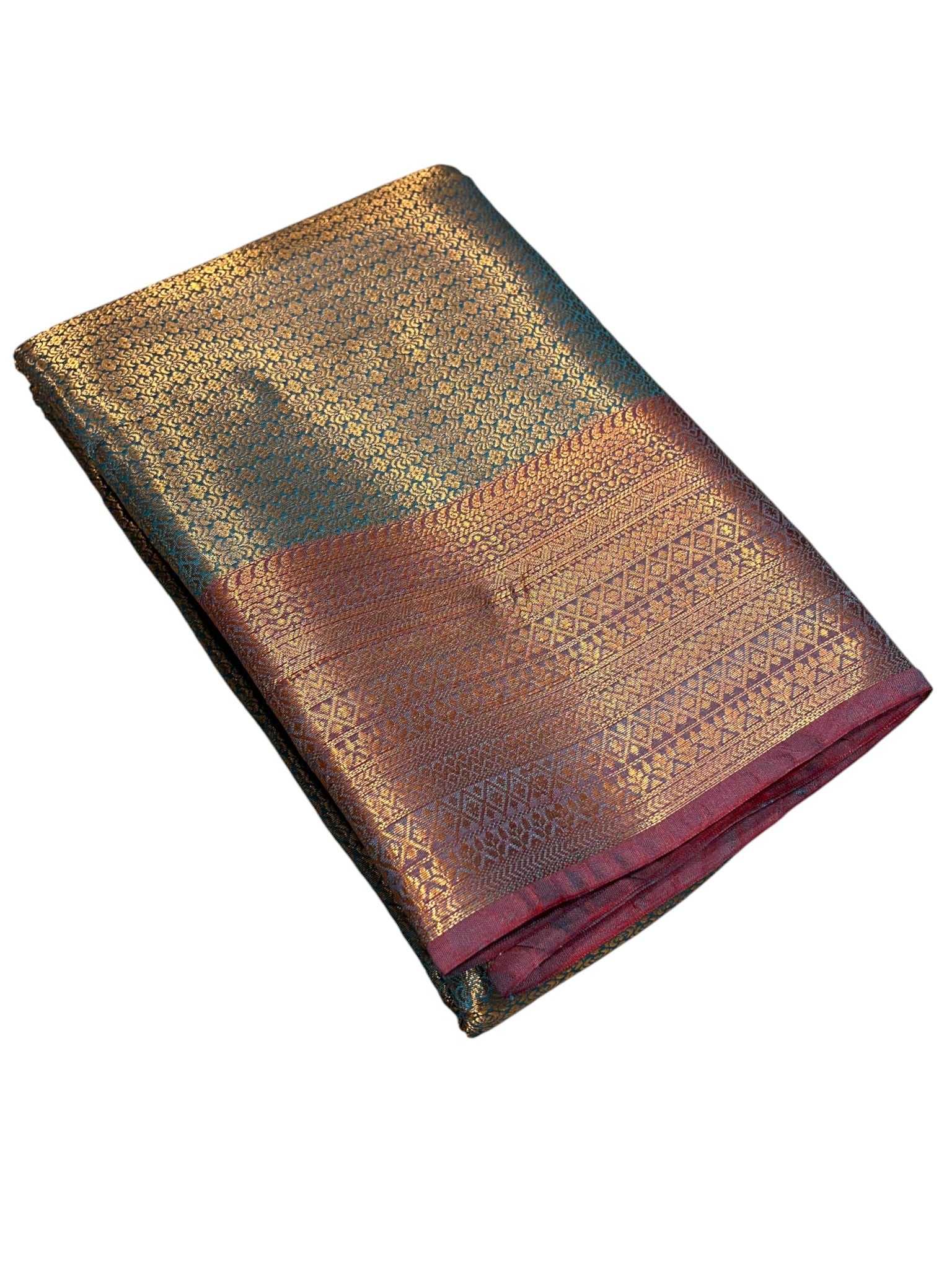 Brown with golden zari blended kanchipuram bridal silk saree crafted with intricate zari work The richly designed brocade blouse with big border adds a touch. Like every kanjivaram saree, this blended kanjivaram silk saree is too designed with heavy silk and the total saree look gives you a perfect traditional appearance for occasions and weddings.