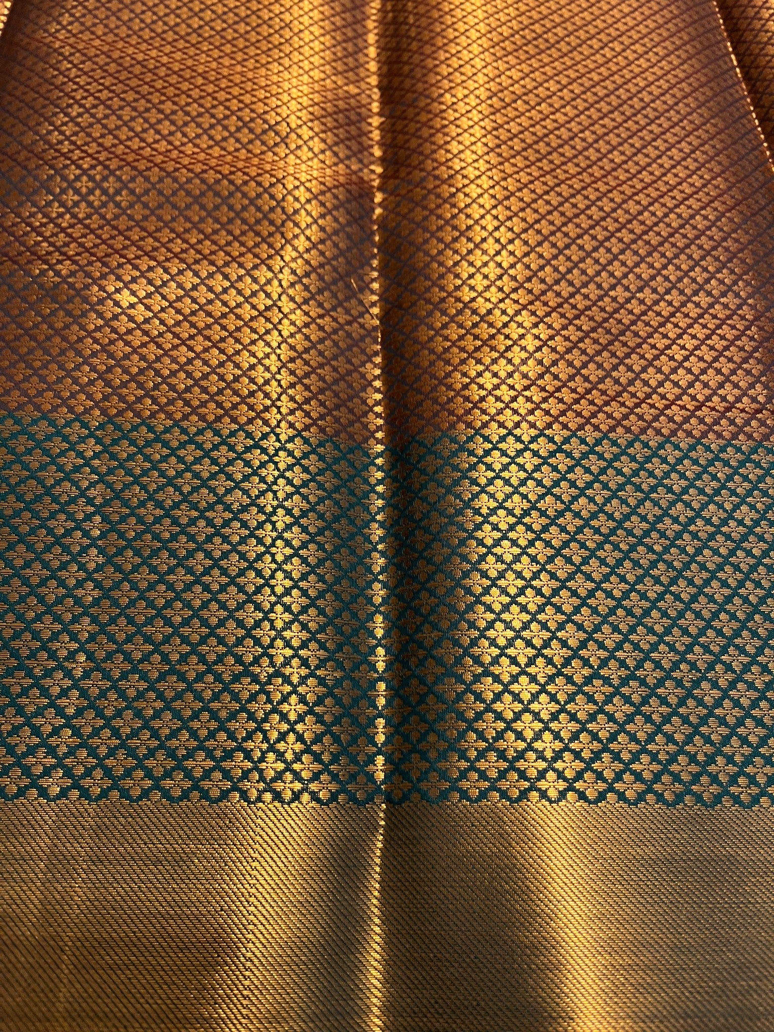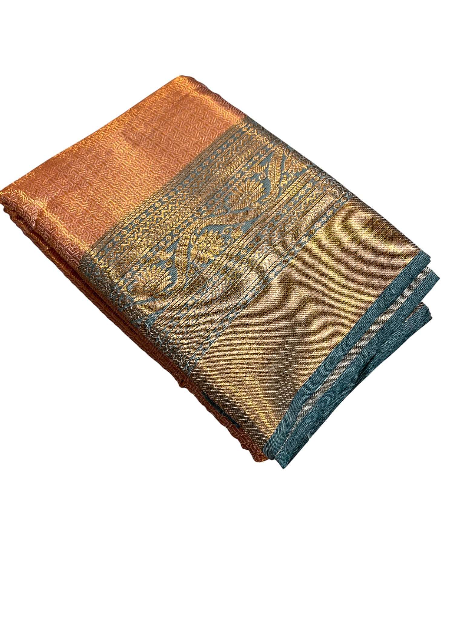 Brown with golden zari blended kanchipuram bridal silk saree crafted with intricate zari work The richly designed brocade blouse with big border adds a touch. Like every kanjivaram saree, this blended kanjivaram silk saree is too designed with heavy silk and the total saree look gives you a perfect traditional appearance for occasions and weddings.