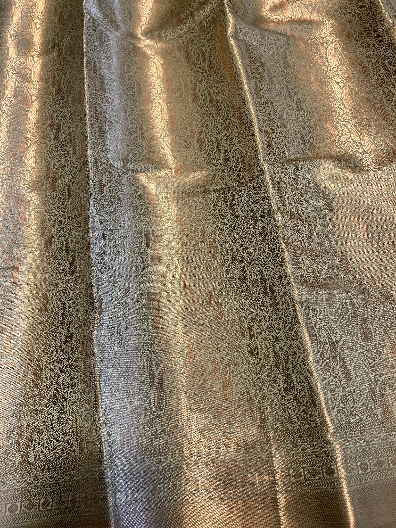 Brown with golden zari blended kanchipuram bridal silk saree crafted with intricate zari work The richly designed brocade blouse with big border adds a touch. Like every kanjivaram saree, this blended kanjivaram silk saree is too designed with heavy silk and the total saree look gives you a perfect traditional appearance for occasions and weddings.