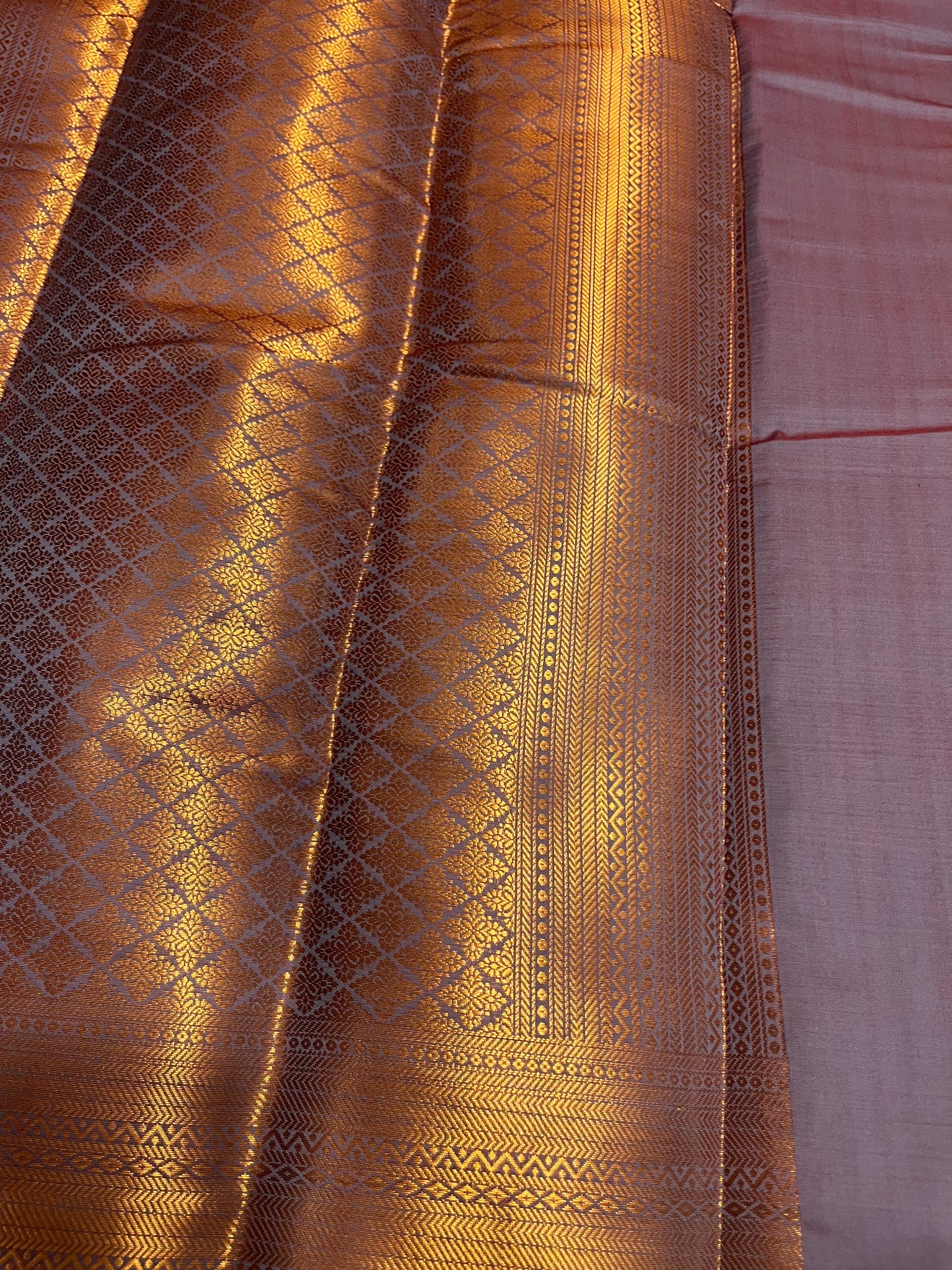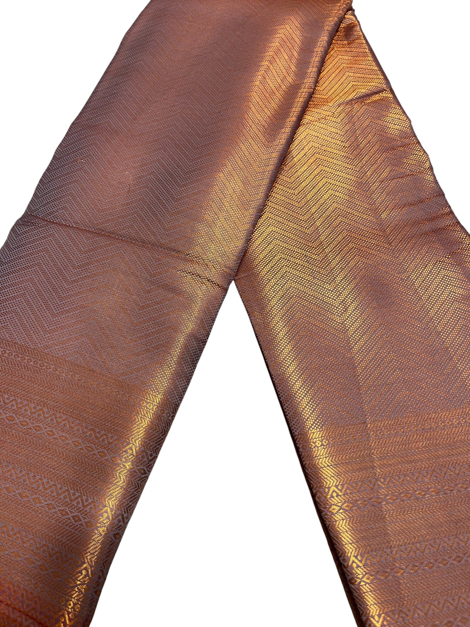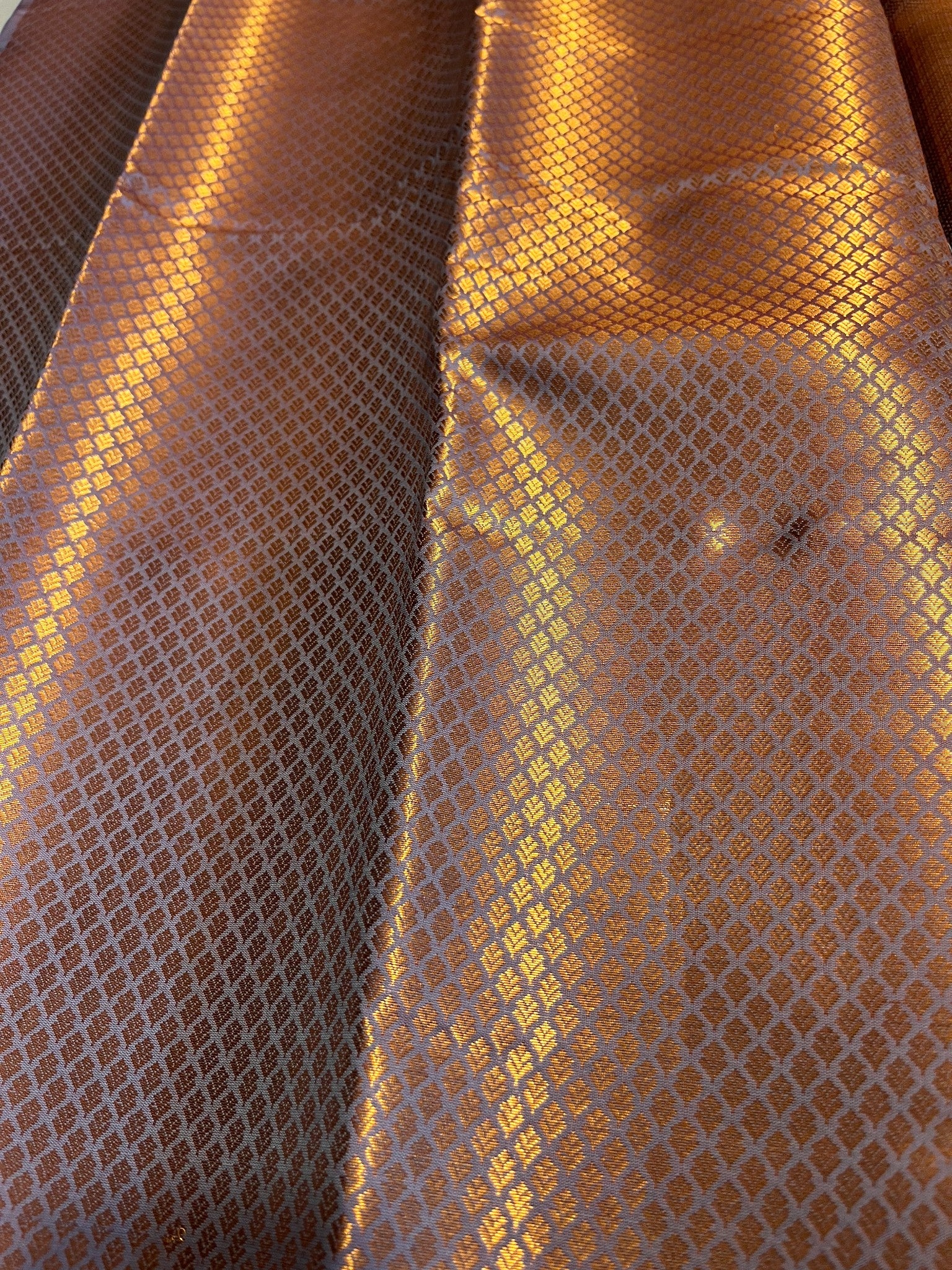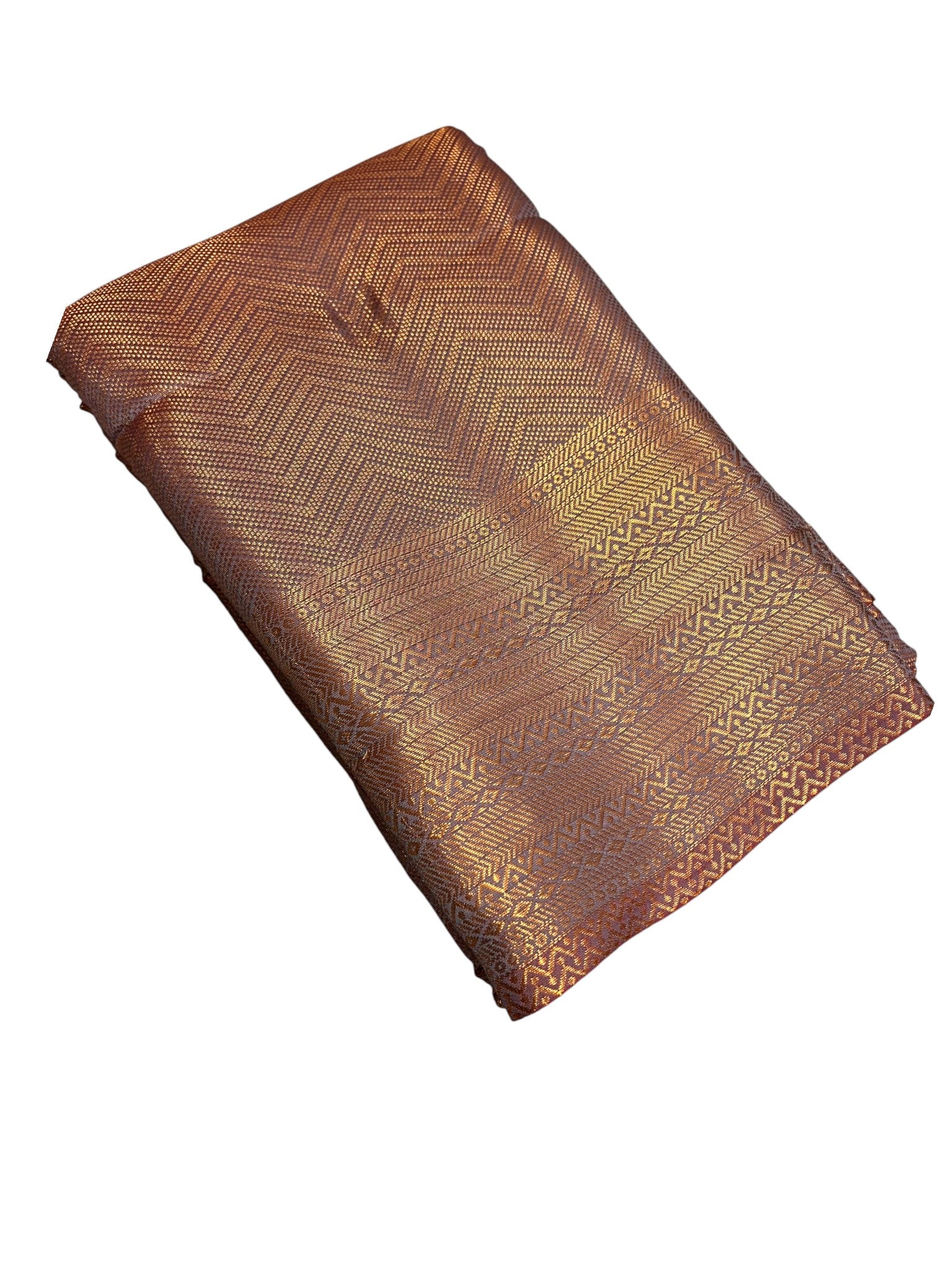 Brown with golden zari blended kanchipuram bridal silk saree crafted with intricate zari work  The richly designed brocade blouse with big border adds a touch. Like every kanjivaram saree, this blended kanjivaram silk saree is too designed with heavy silk and the total saree look gives you a perfect traditional appearance for occasions and weddings.