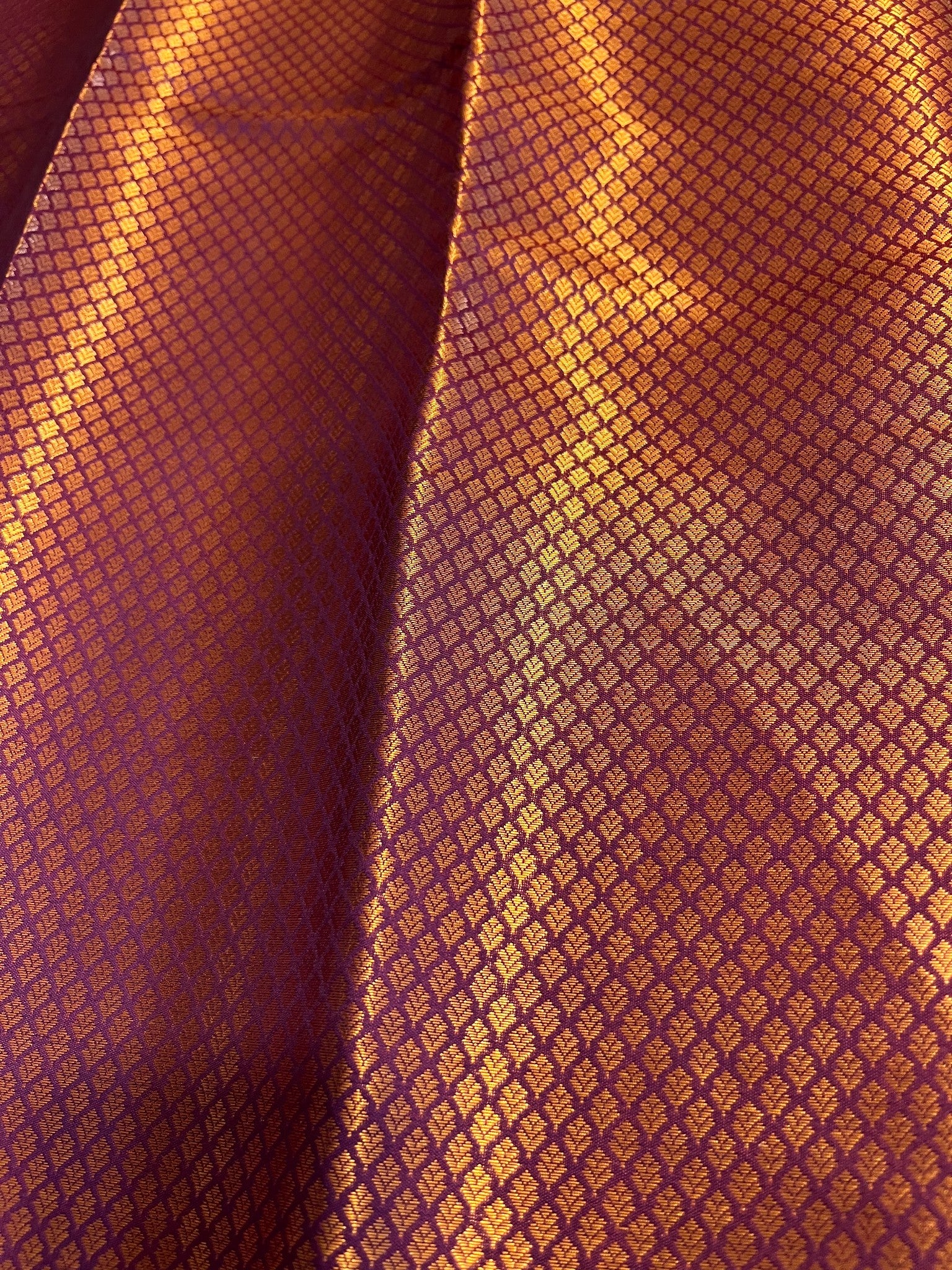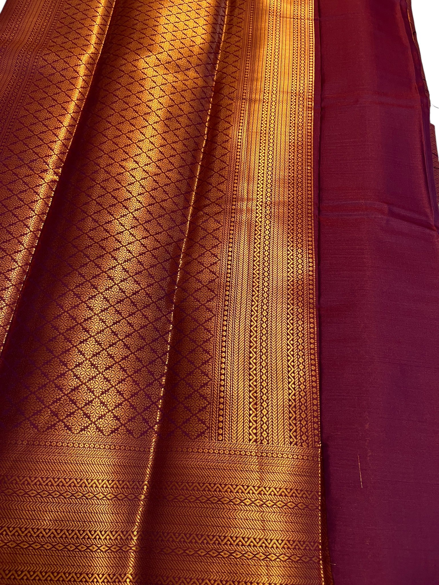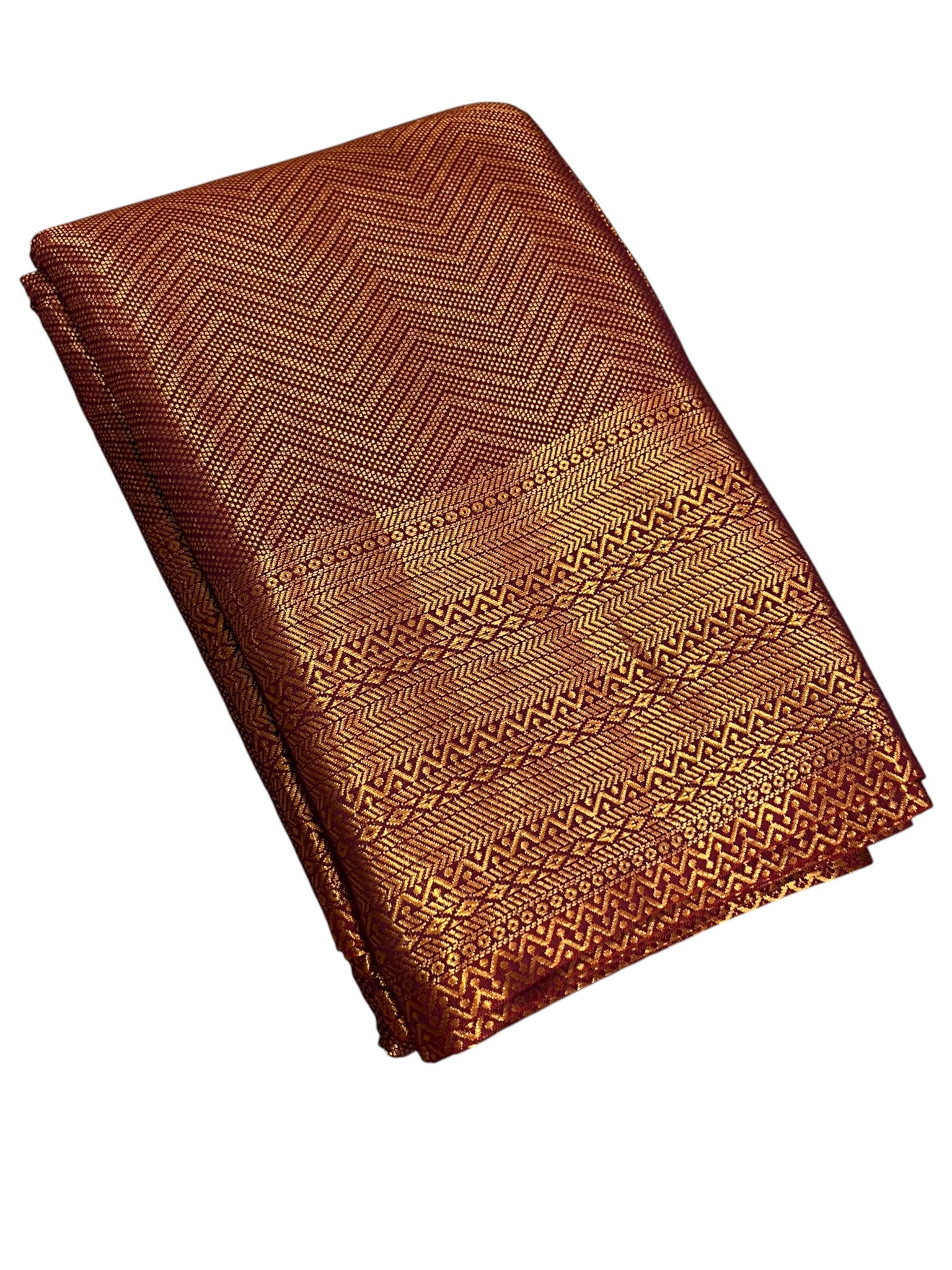 Brown with golden zari blended kanchipuram bridal silk saree crafted with intricate zari work The richly designed brocade blouse with big border adds a touch. Like every kanjivaram saree, this blended kanjivaram silk saree is too designed with heavy silk and the total saree look gives you a perfect traditional appearance for occasions and weddings.
