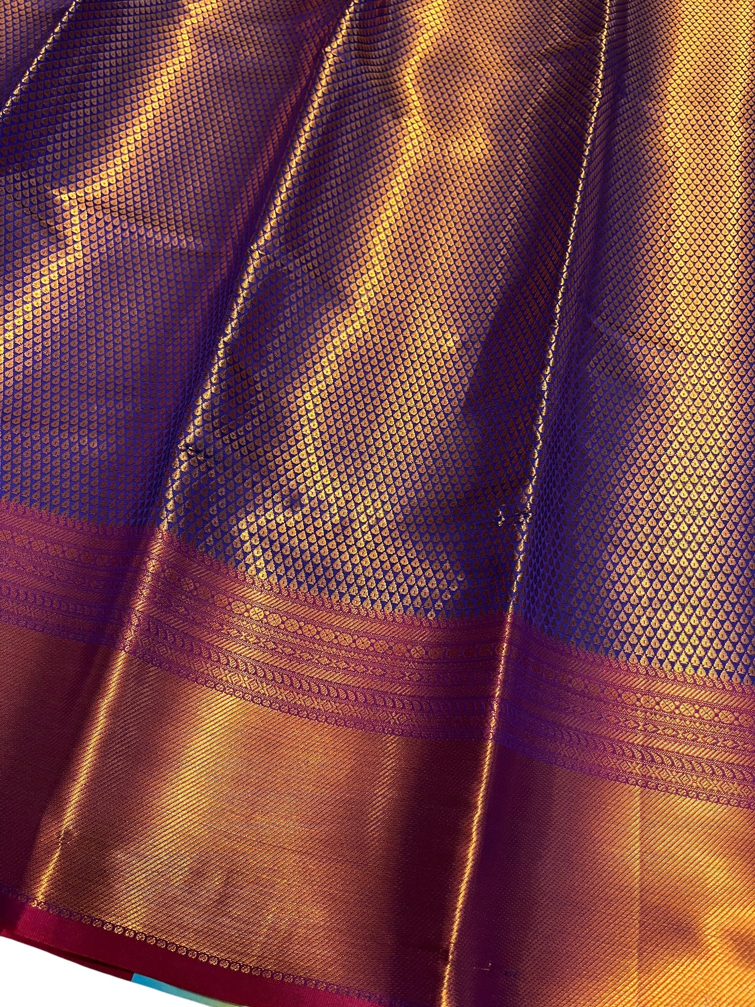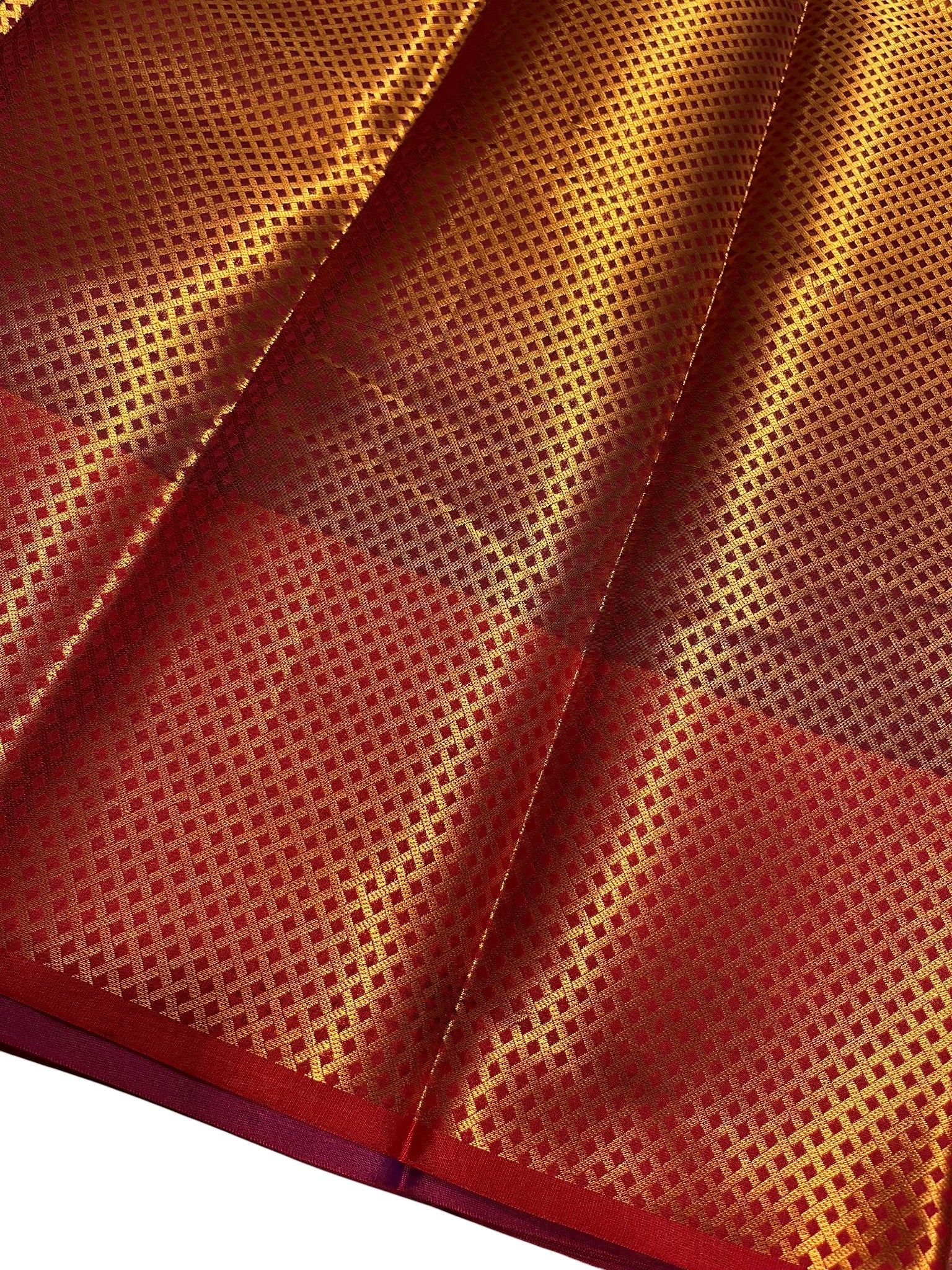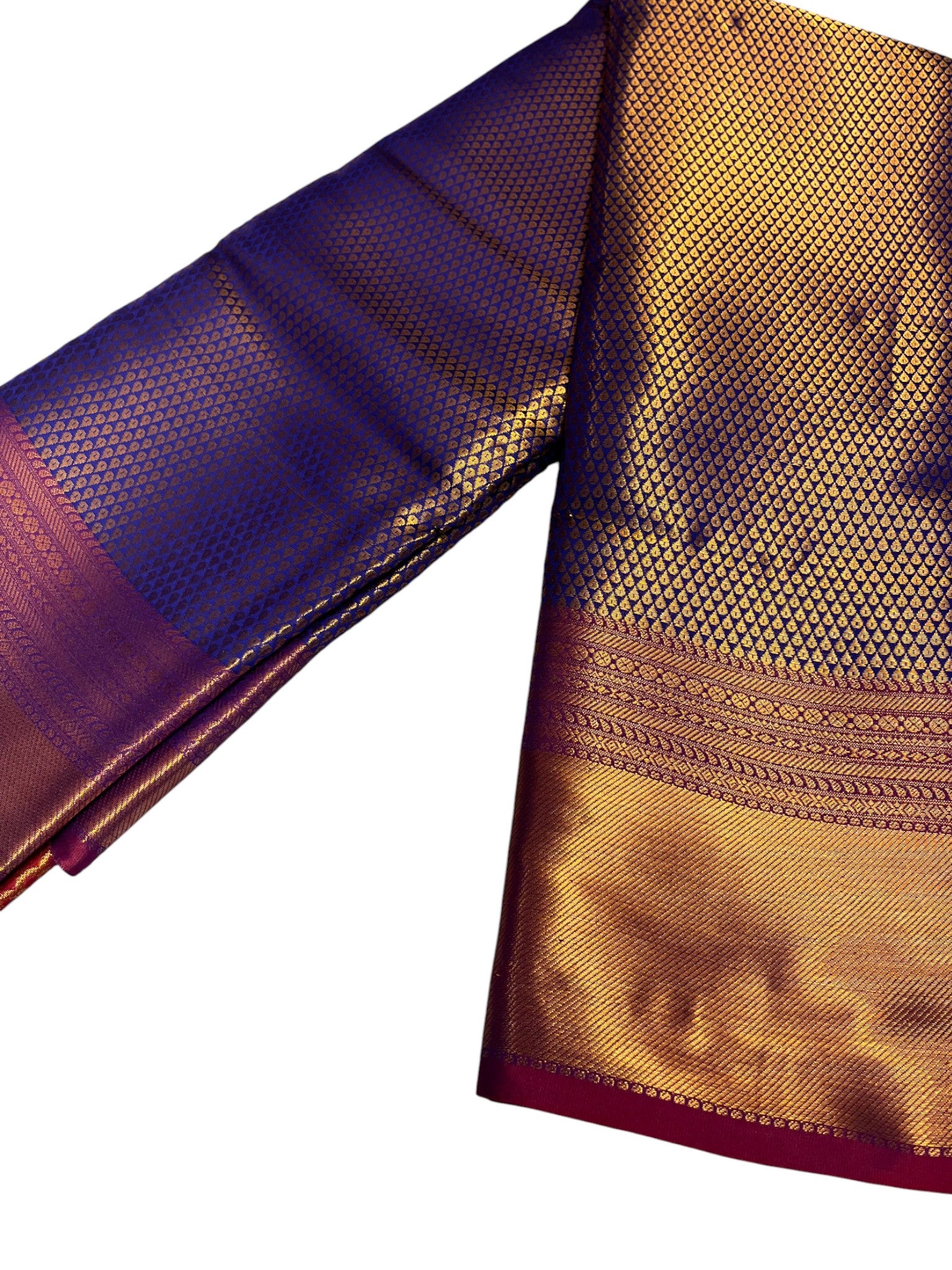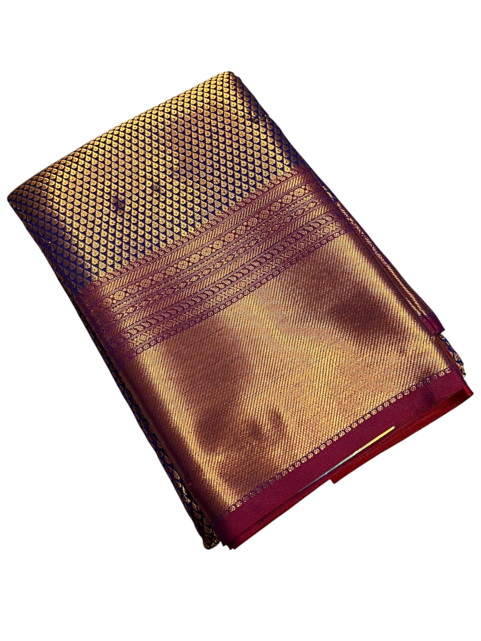 Brown with golden zari blended kanchipuram bridal silk saree crafted with intricate zari work The richly designed brocade blouse with big border adds a touch. Like every kanjivaram saree, this blended kanjivaram silk saree is too designed with heavy silk and the total saree look gives you a perfect traditional appearance for occasions and weddings.