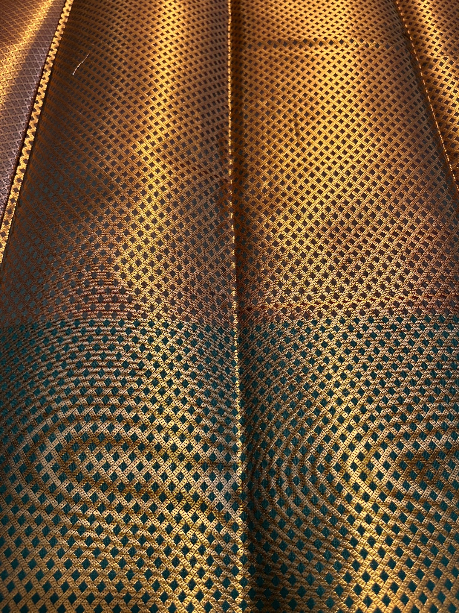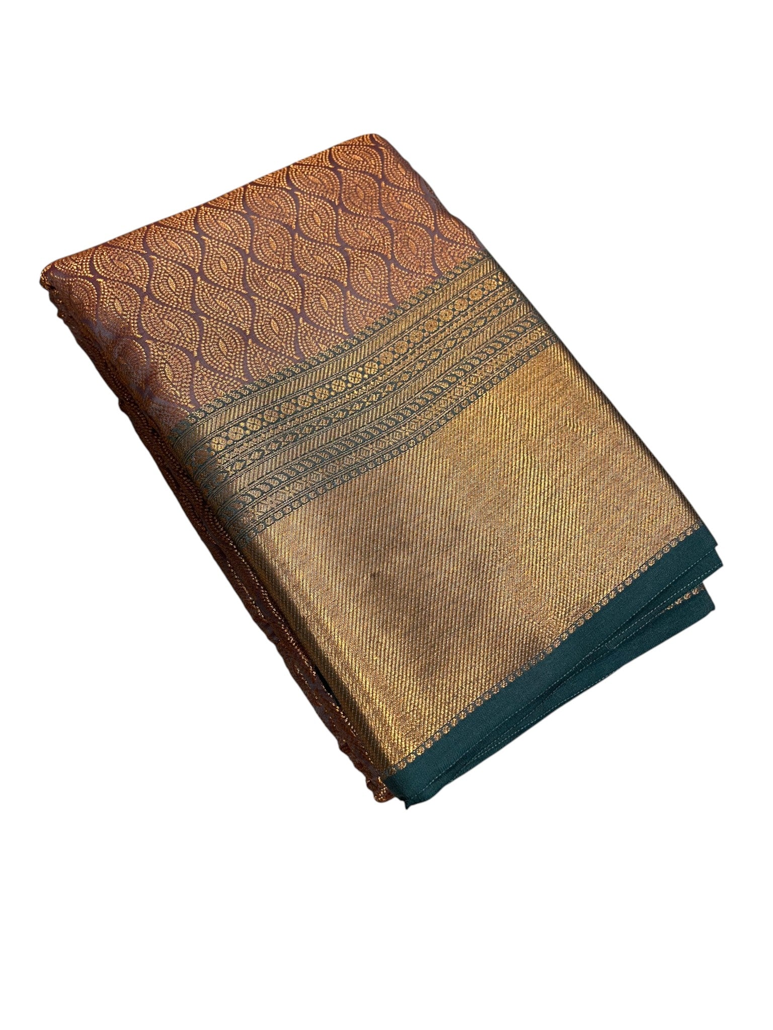 Brown with golden zari blended kanchipuram bridal silk saree crafted with intricate zari work The richly designed brocade blouse with big border adds a touch. Like every kanjivaram saree, this blended kanjivaram silk saree is too designed with heavy silk and the total saree look gives you a perfect traditional appearance for occasions and weddings.