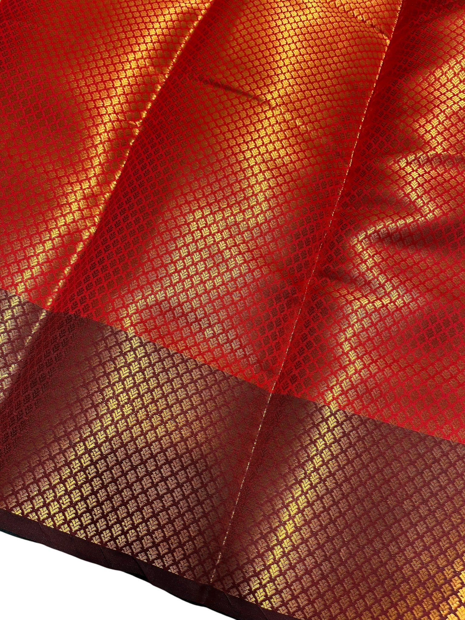 Brown with golden zari blended kanchipuram bridal silk saree crafted with intricate zari work The richly designed brocade blouse with big border adds a touch. Like every kanjivaram saree, this blended kanjivaram silk saree is too designed with heavy silk and the total saree look gives you a perfect traditional appearance for occasions and weddings.