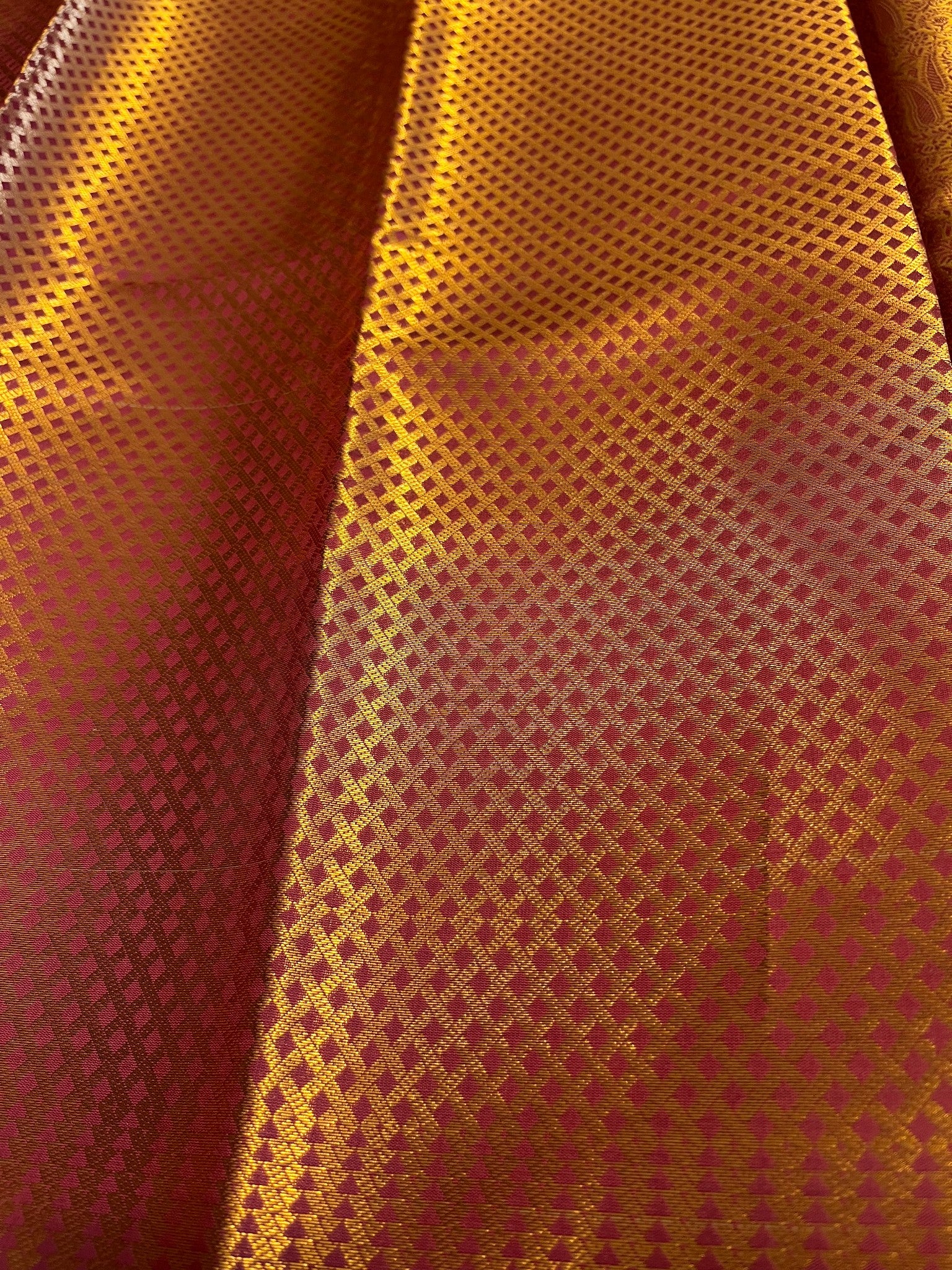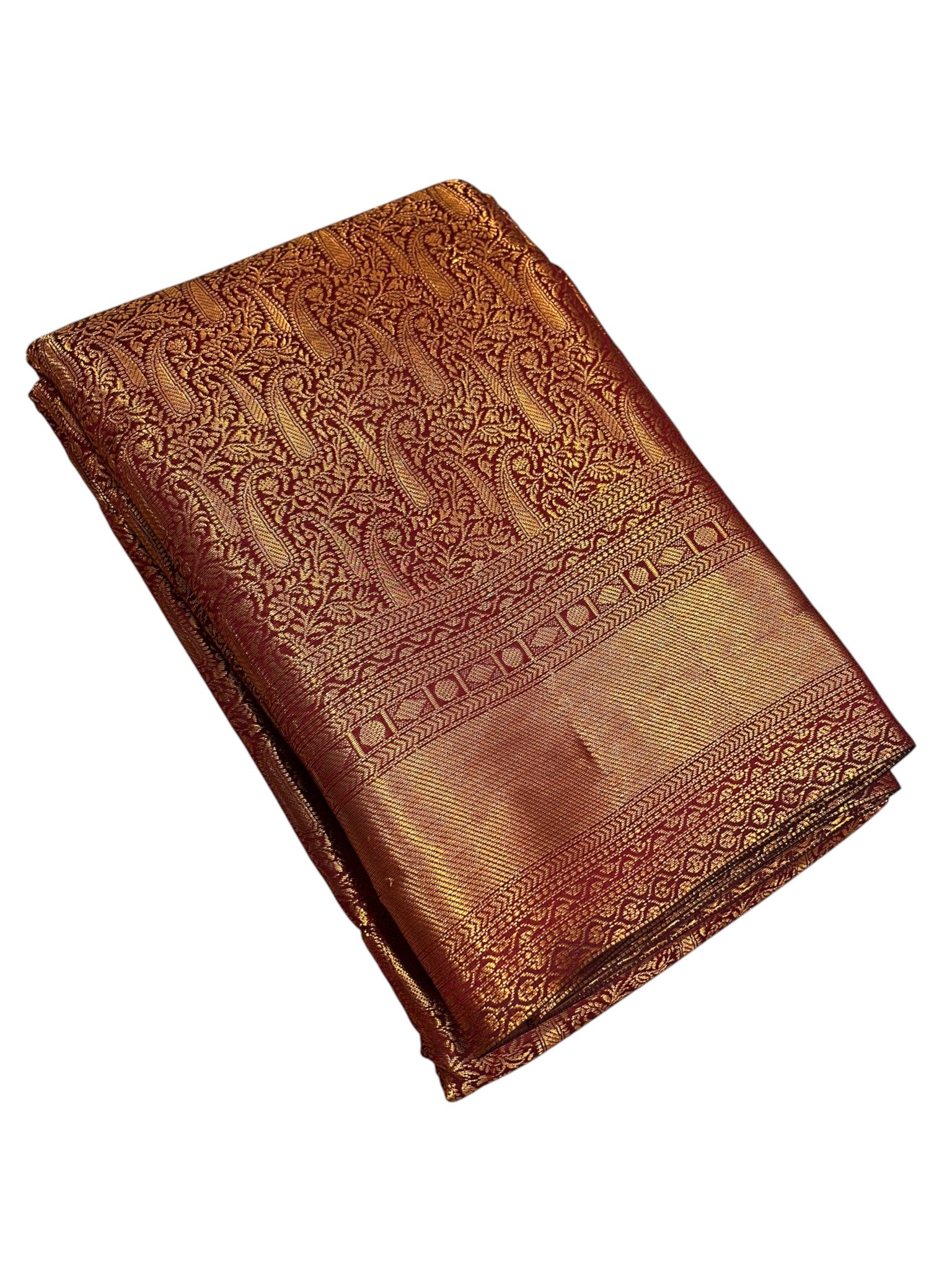Brown with golden zari blended kanchipuram bridal silk saree crafted with intricate zari work The richly designed brocade blouse with big border adds a touch. Like every kanjivaram saree, this blended kanjivaram silk saree is too designed with heavy silk and the total saree look gives you a perfect traditional appearance for occasions and weddings.