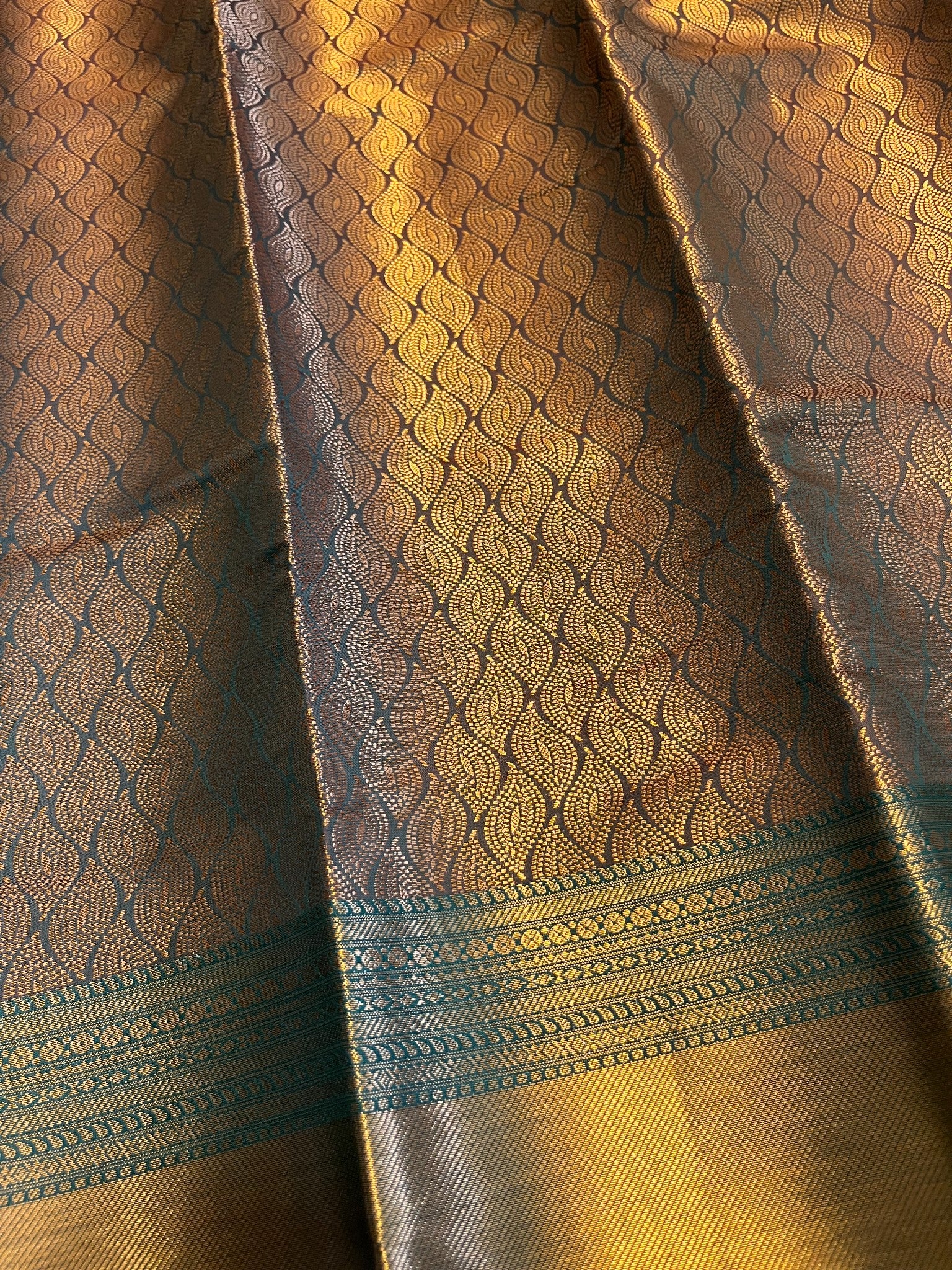 Brown with golden zari blended kanchipuram bridal silk saree crafted with intricate zari work  The richly designed brocade blouse with big border adds a touch. Like every kanjivaram saree, this blended kanjivaram silk saree is too designed with heavy silk and the total saree look gives you a perfect traditional appearance for occasions and weddings.