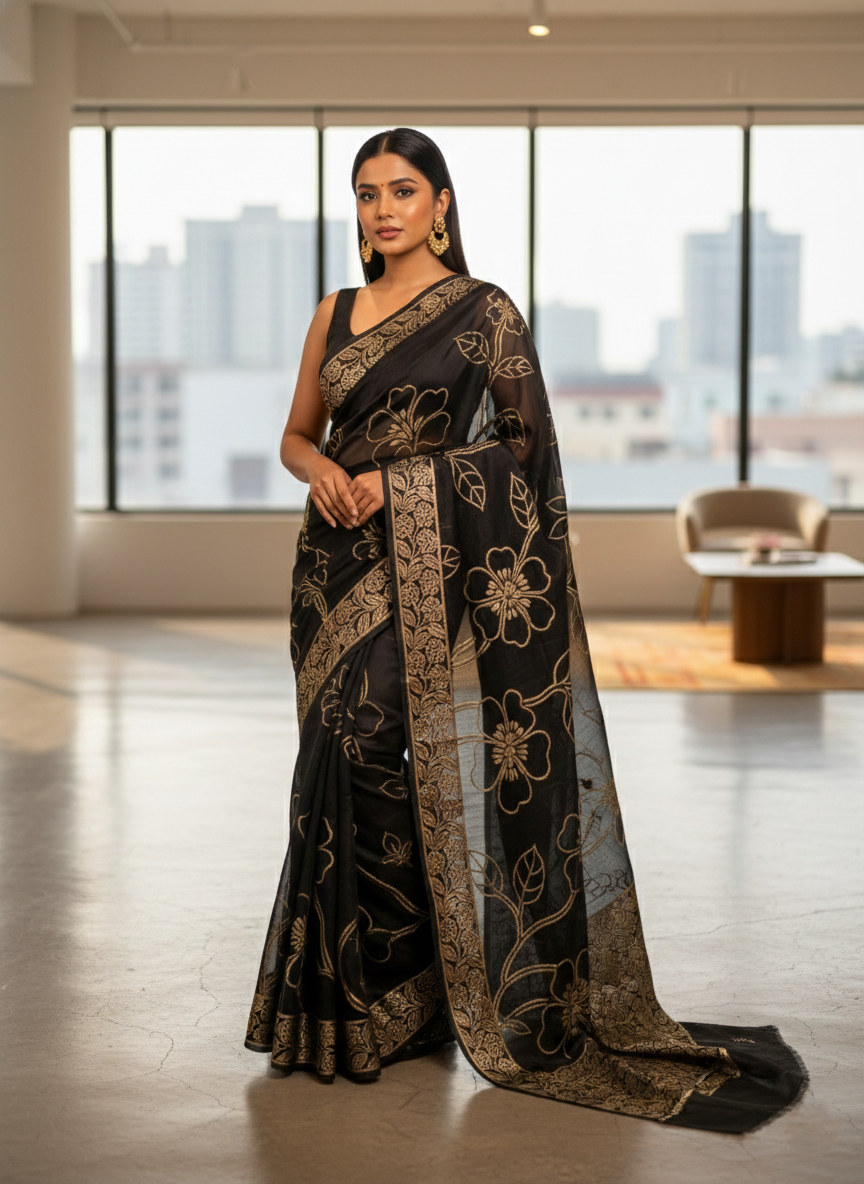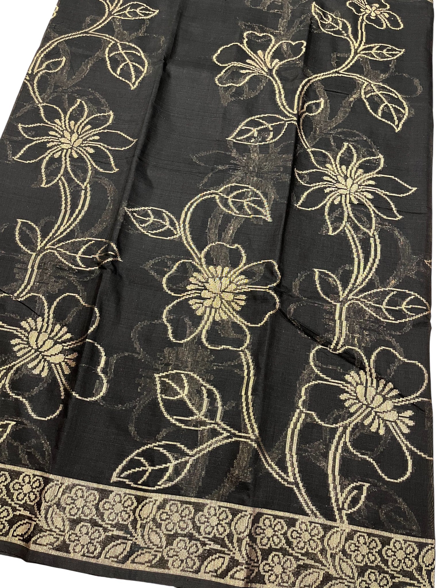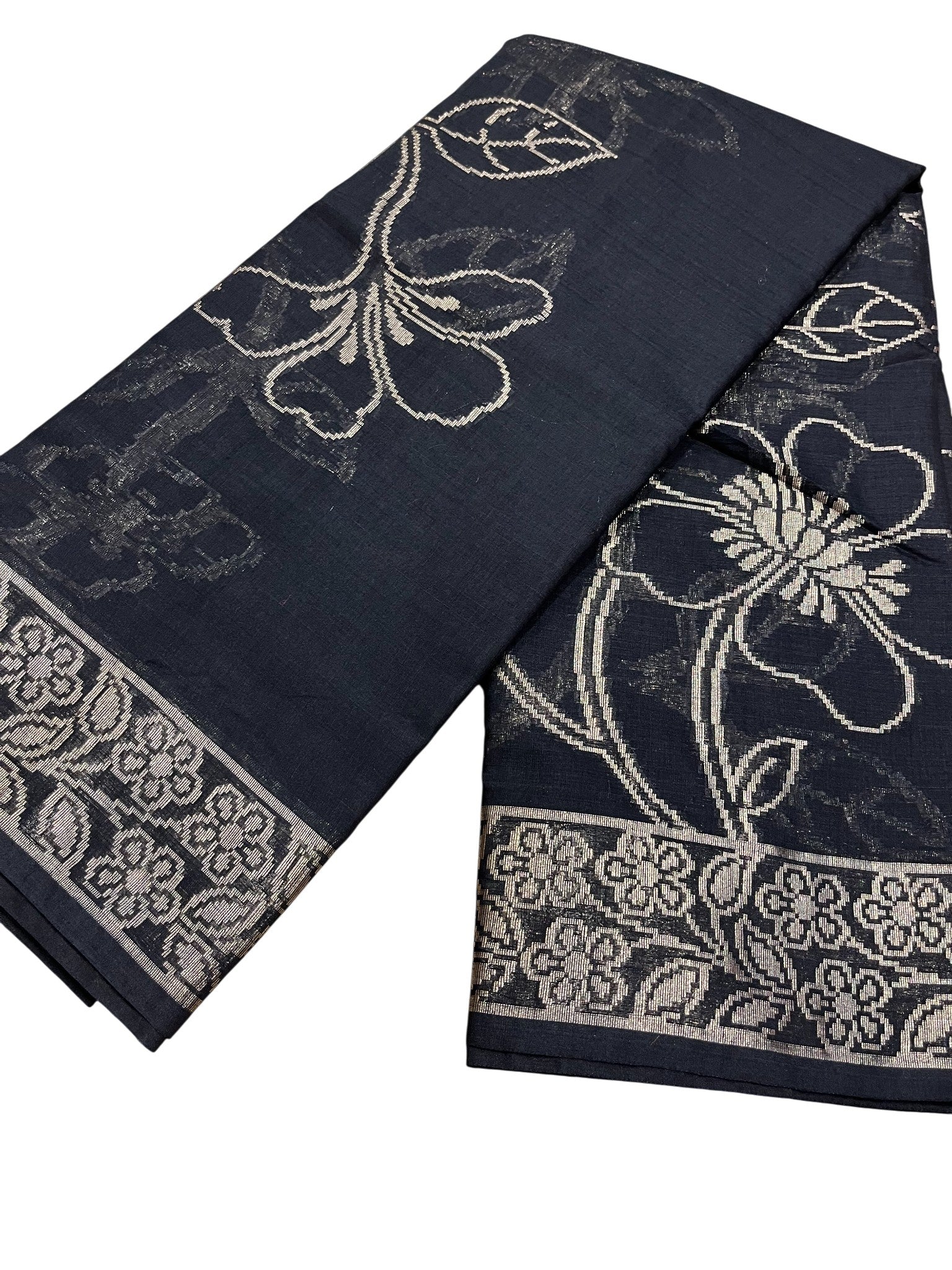 Southloom Kerala Cotton Saree with Floral Woven Works Across Body in Black