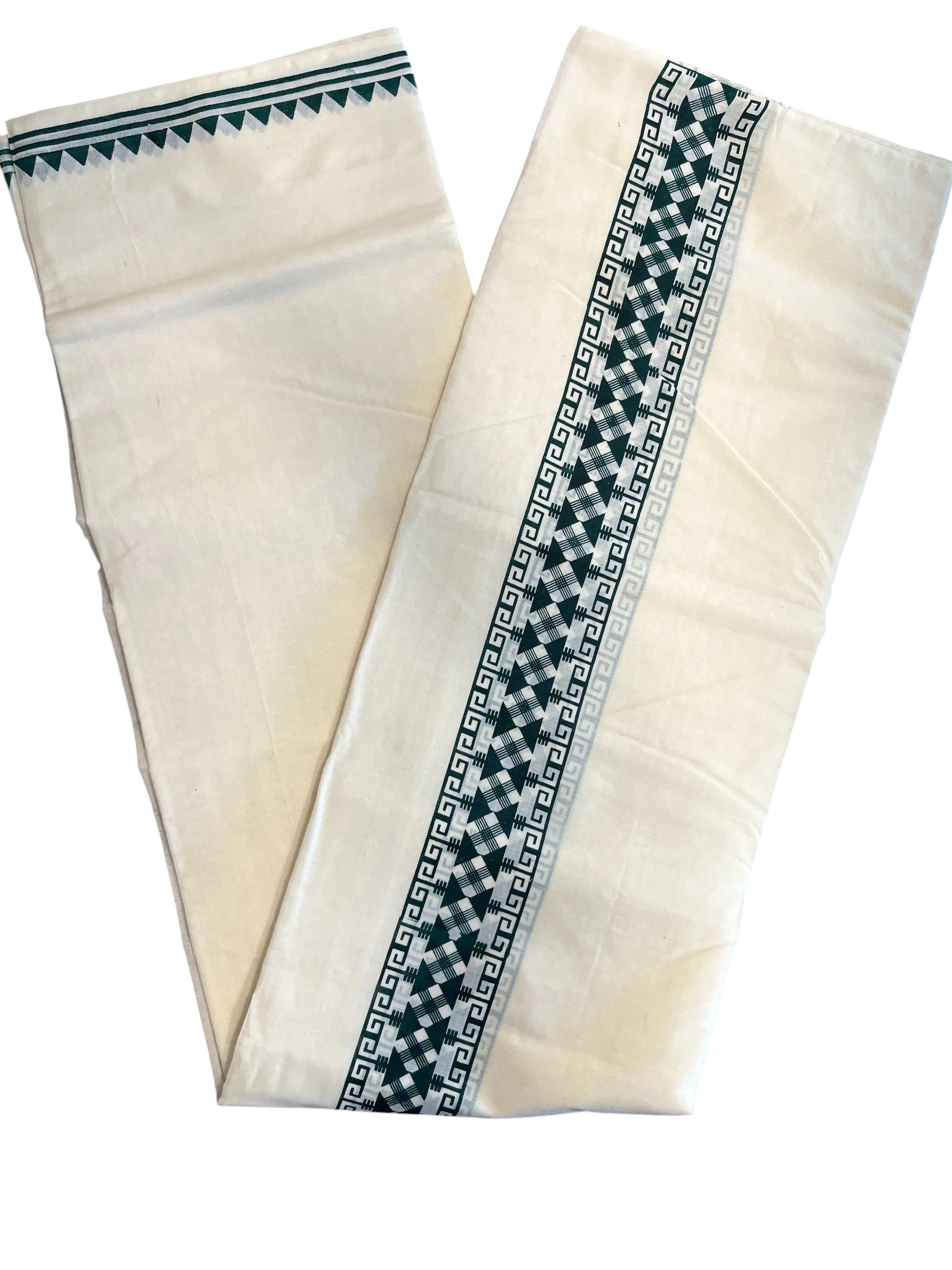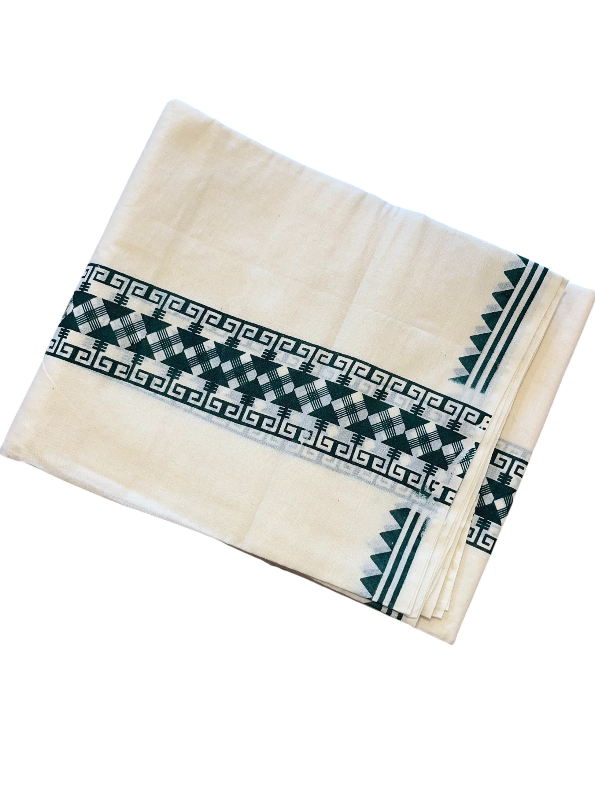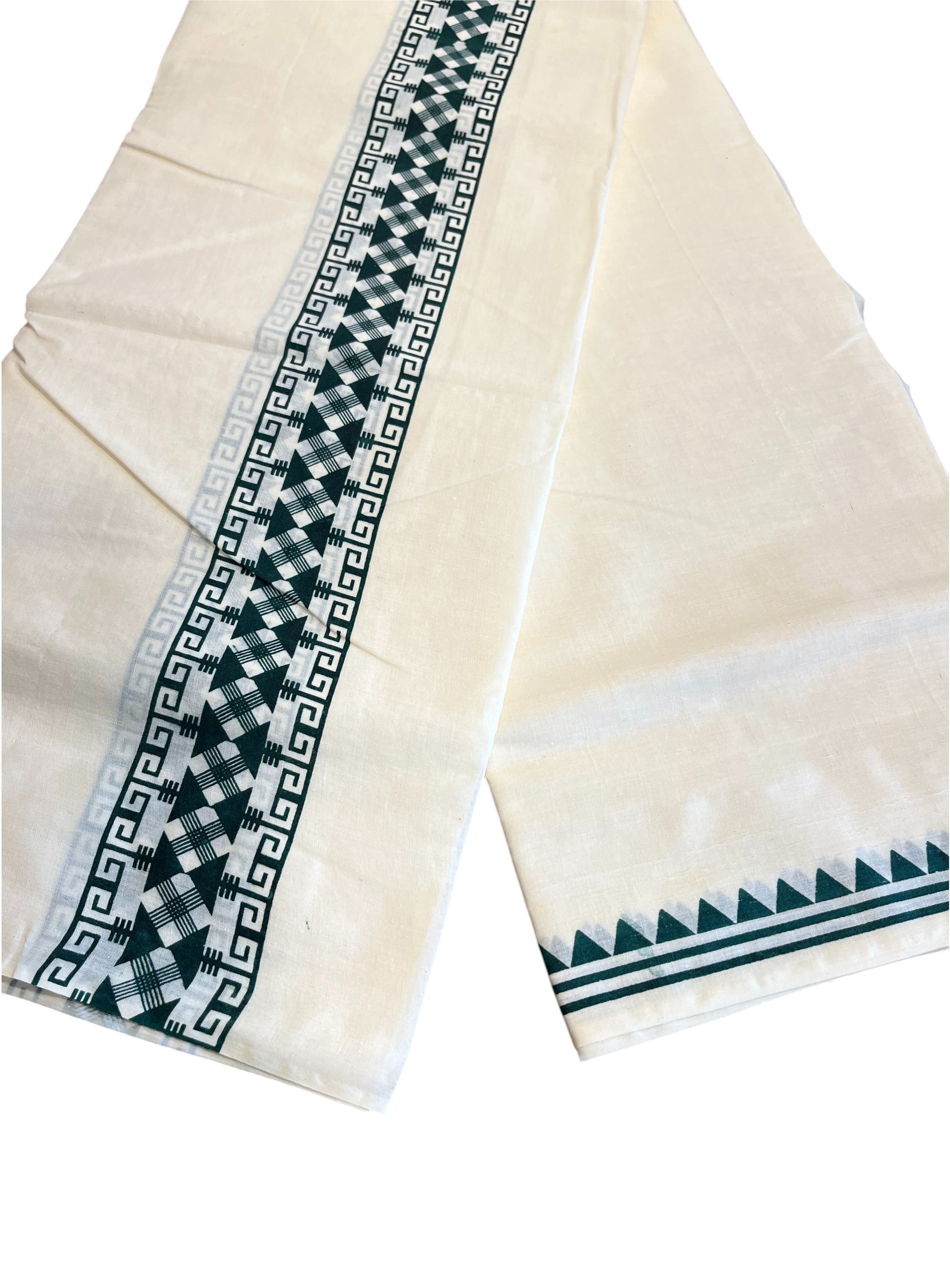 Southloom Pure Cotton Double Mundu with Block Prints on Dark Green Kara (South Indian Kerala Dhoti)