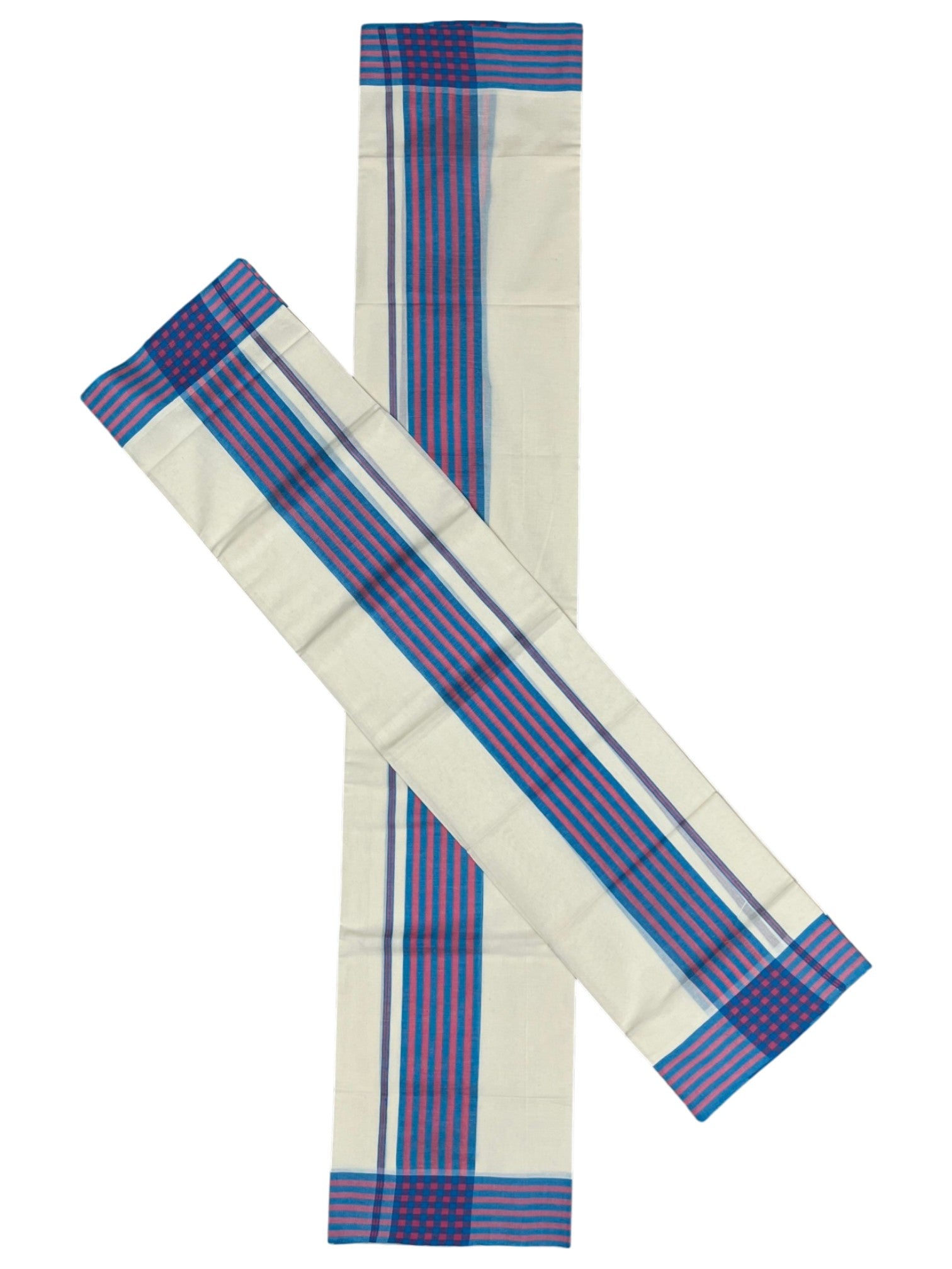 Southloom Pure Cotton Kerala Single Mulloth Set Mundu (Mundum Neriyathum) Blue & Pink Border in 2.50 mtrs SL243