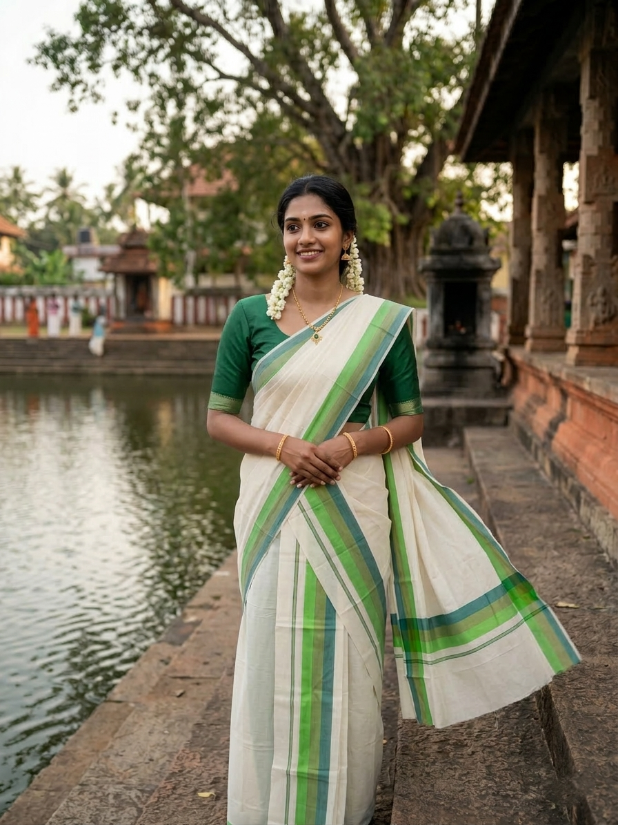 Southloom Pure Cotton Kerala Single Mulloth Set Mundu (Mundum Neriyathum) Green Border in 2.50 mtrs SL243