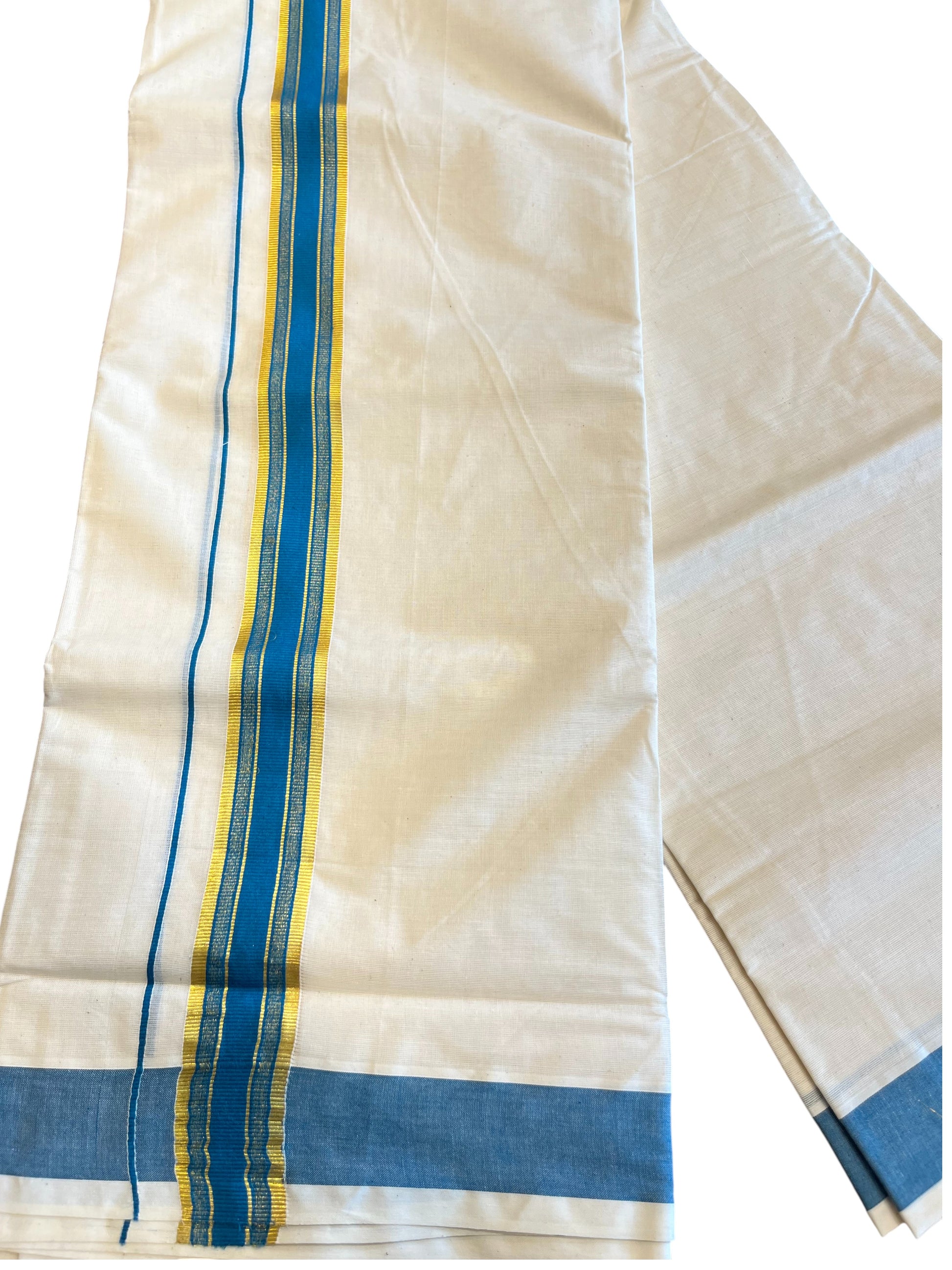 Southloom Pure Cotton Mundu with Gold Kasavu and Blue Border (South Indian Kerala Dhoti)