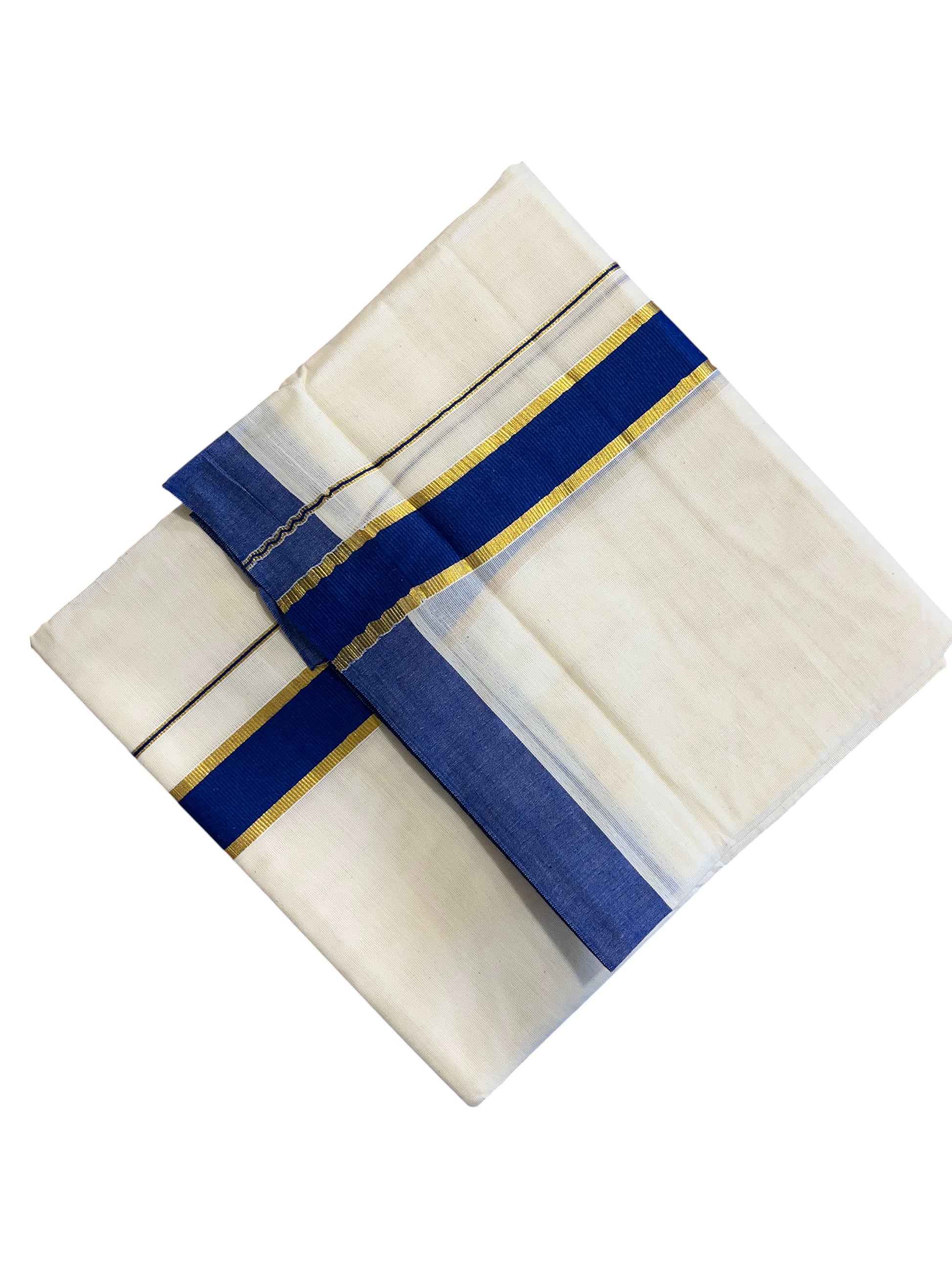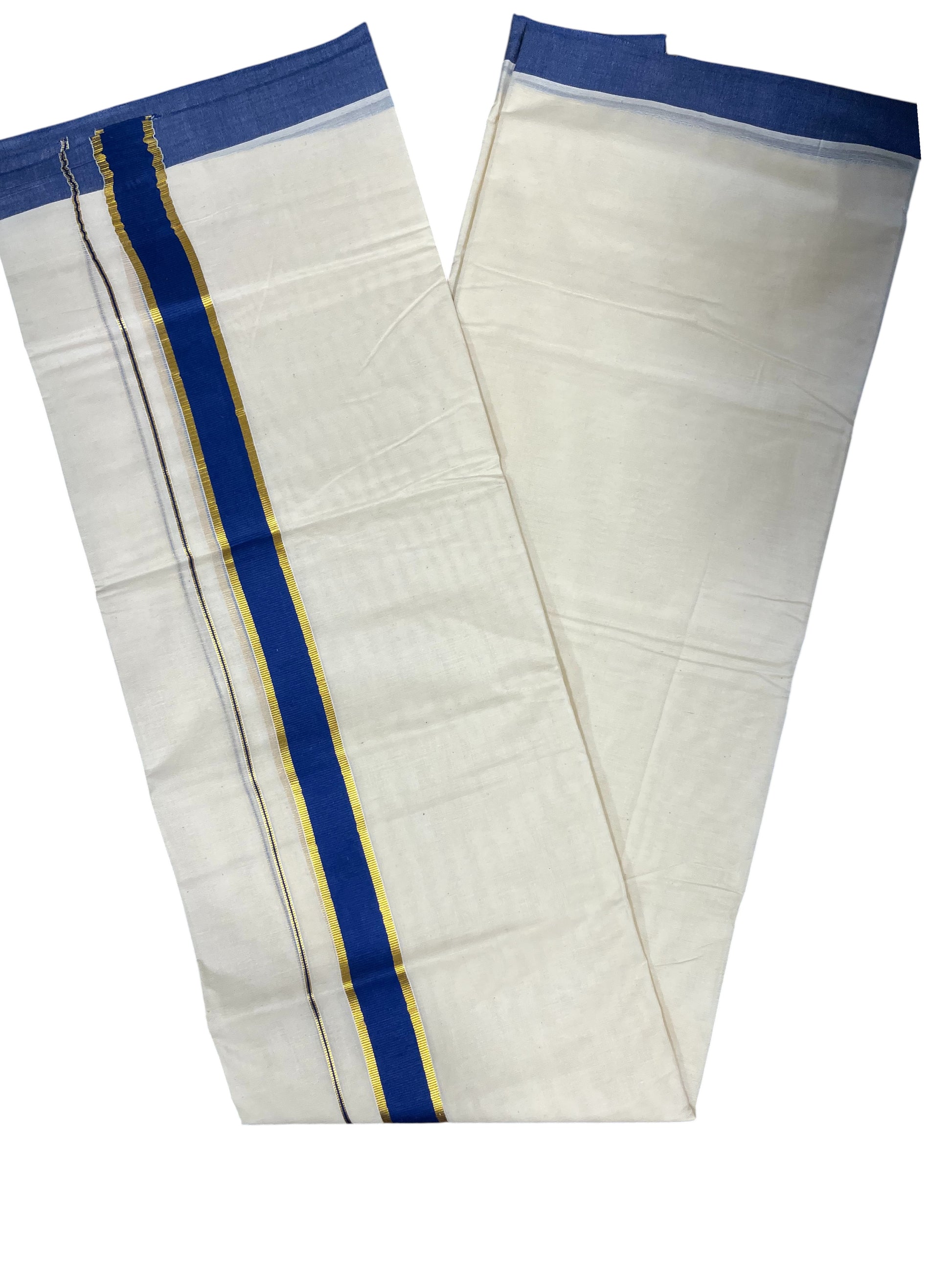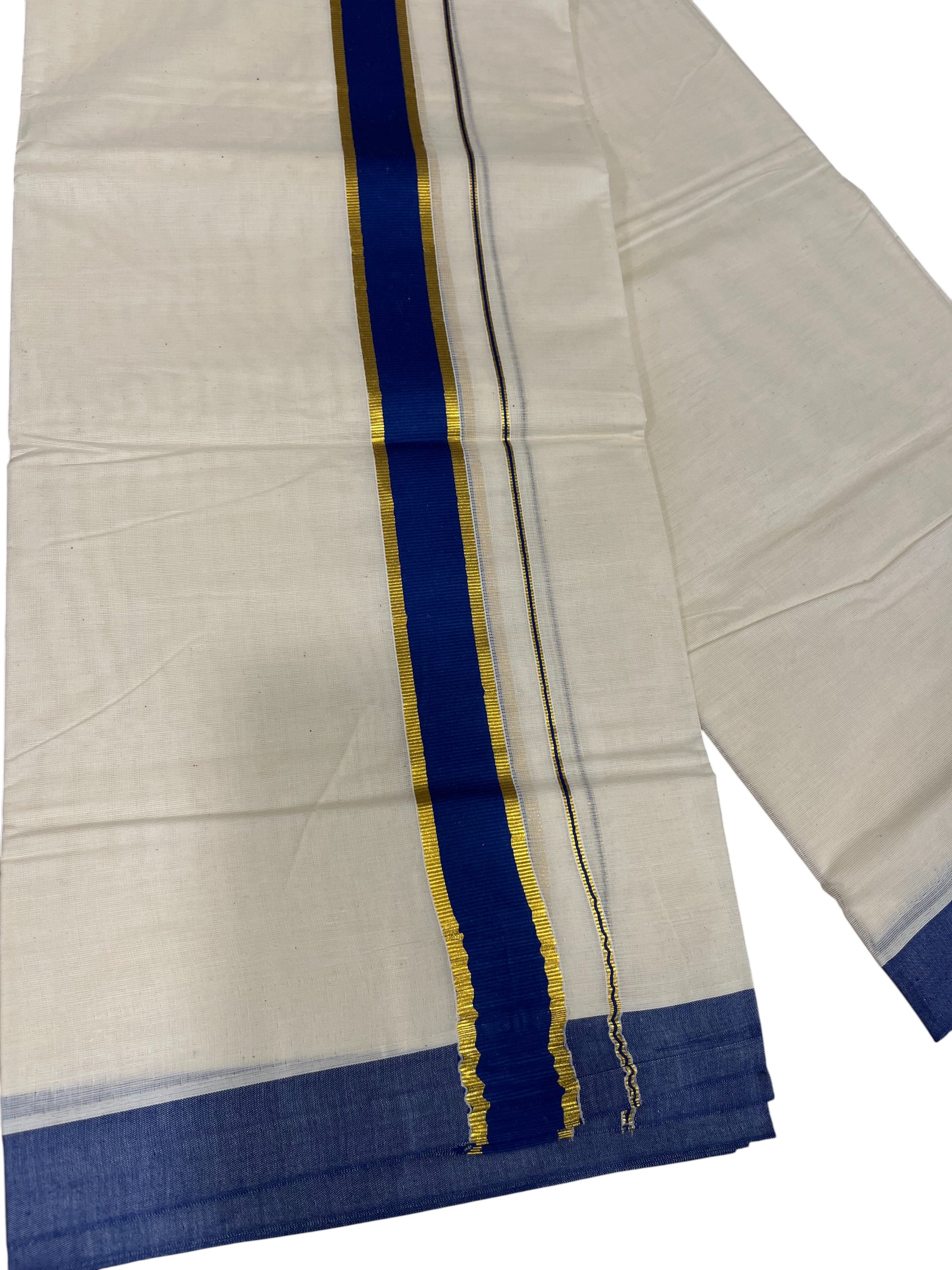 Southloom Pure Cotton Mundu with Gold Kasavu and Blue Colour Border (South Indian Kerala Dhoti)