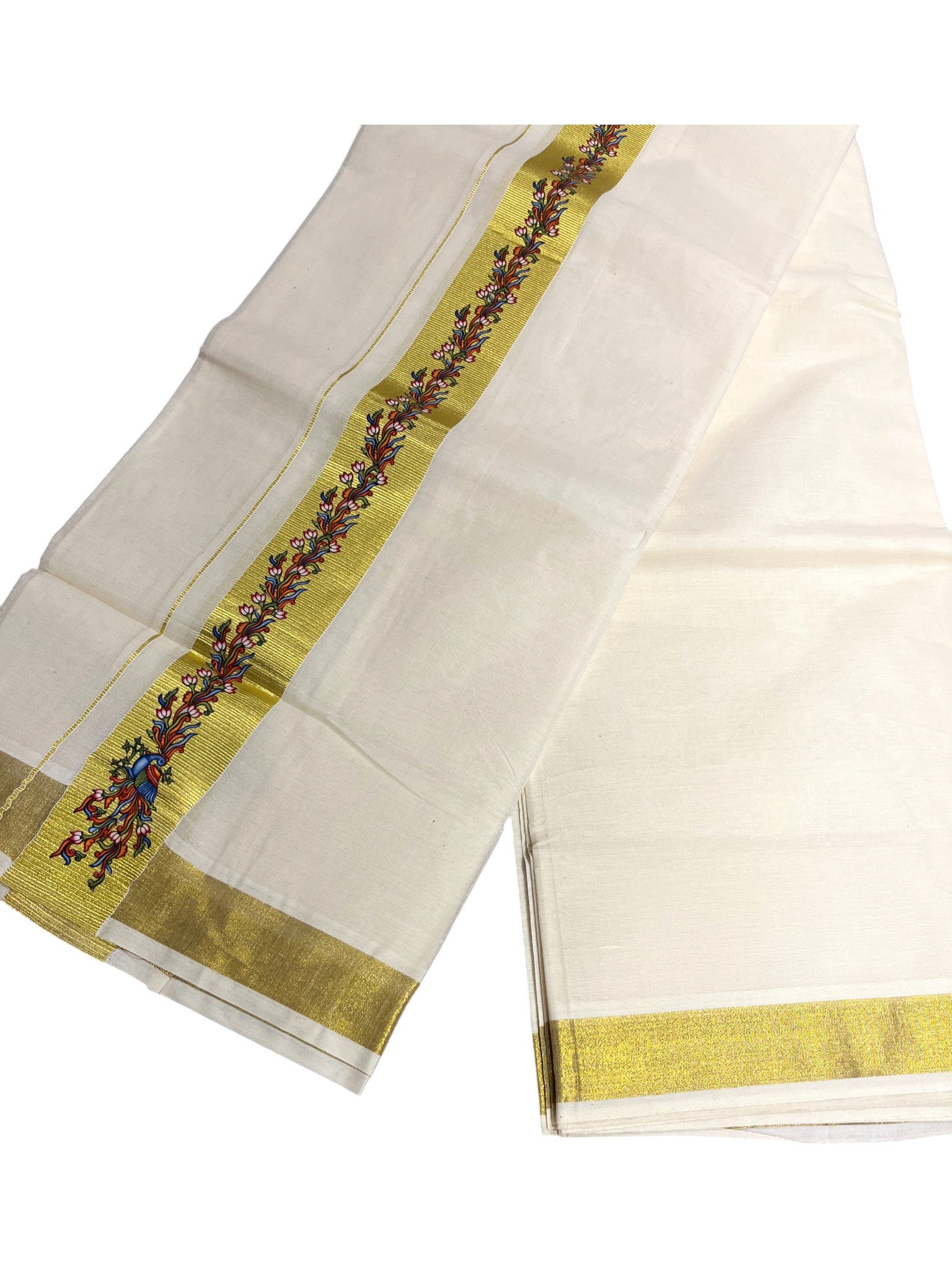 Southloom Pure Cotton Off White Double Mundu with Mural Printed Design Along Kasavu Kara