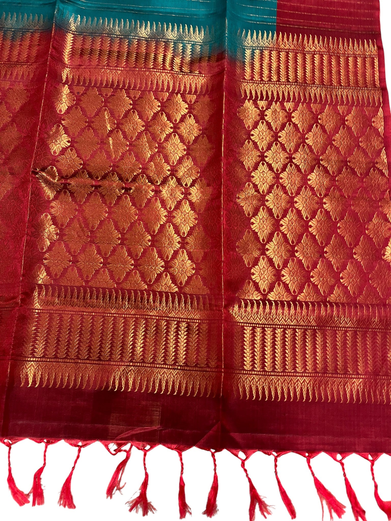 Step into tradition and elegance with this exquisite Pure Handloom Bridal Kanchipuram Silk Saree, featuring the iconic Korvai weaving technique, a hallmark of skilled craftsmanship from Kanchipuram. This masterpiece is a perfect blend of heritage, luxury, and timeless beauty.