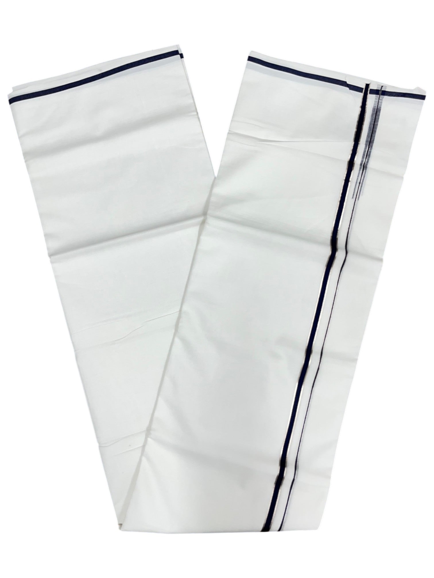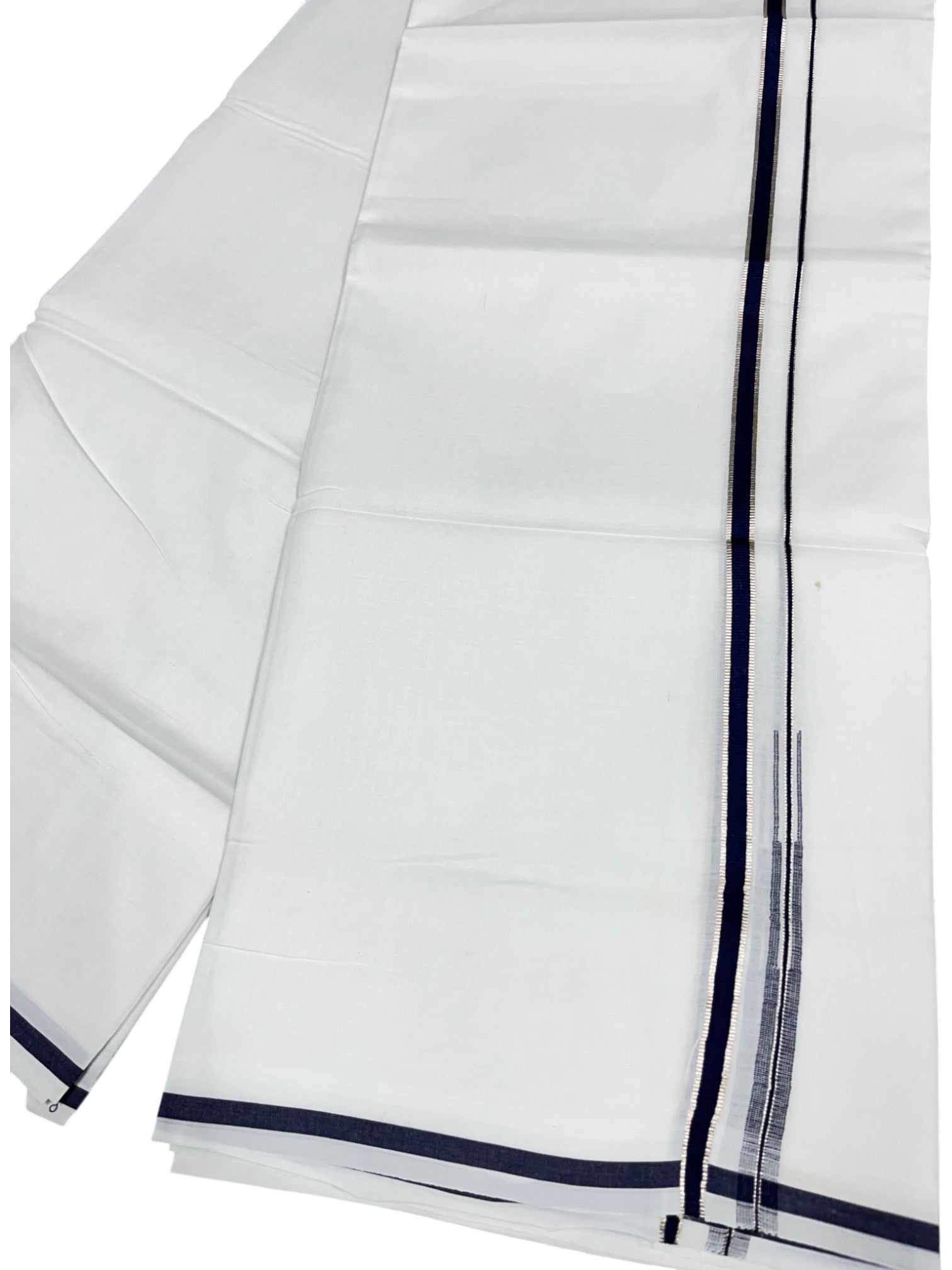 Southloom Pure White Cotton Double Mundu with Silver and Blue Border (South Indian Dhoti)