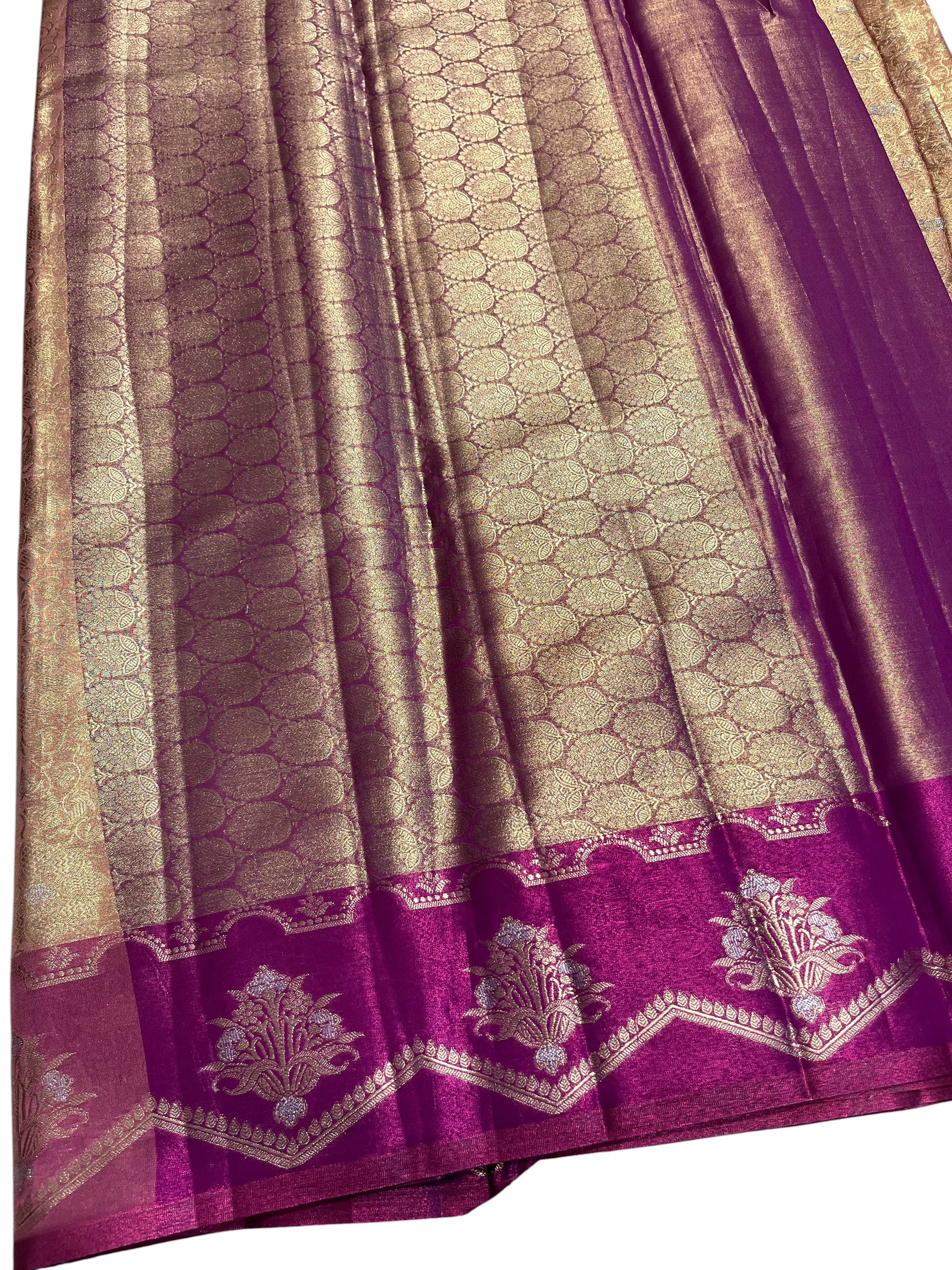 Southloom Semi Banarasi Katan Tissue Saree with Woven Work on Body and Borders (Golden & Magenta)