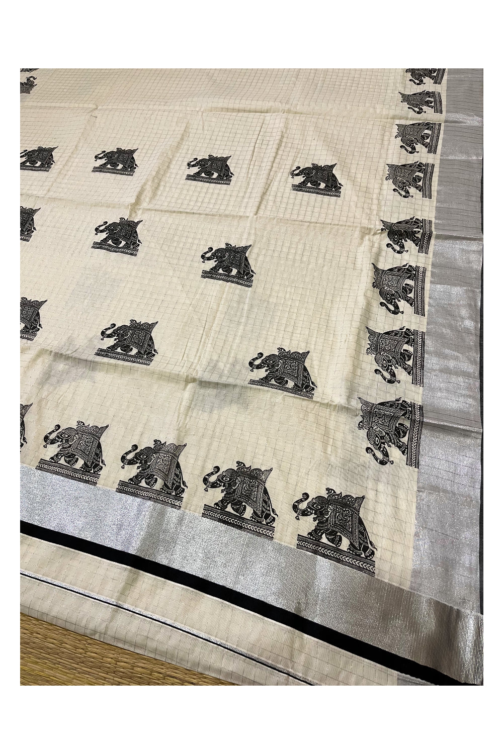 Southloom Silver Check Saree with Black Border and Elephant Block Prints