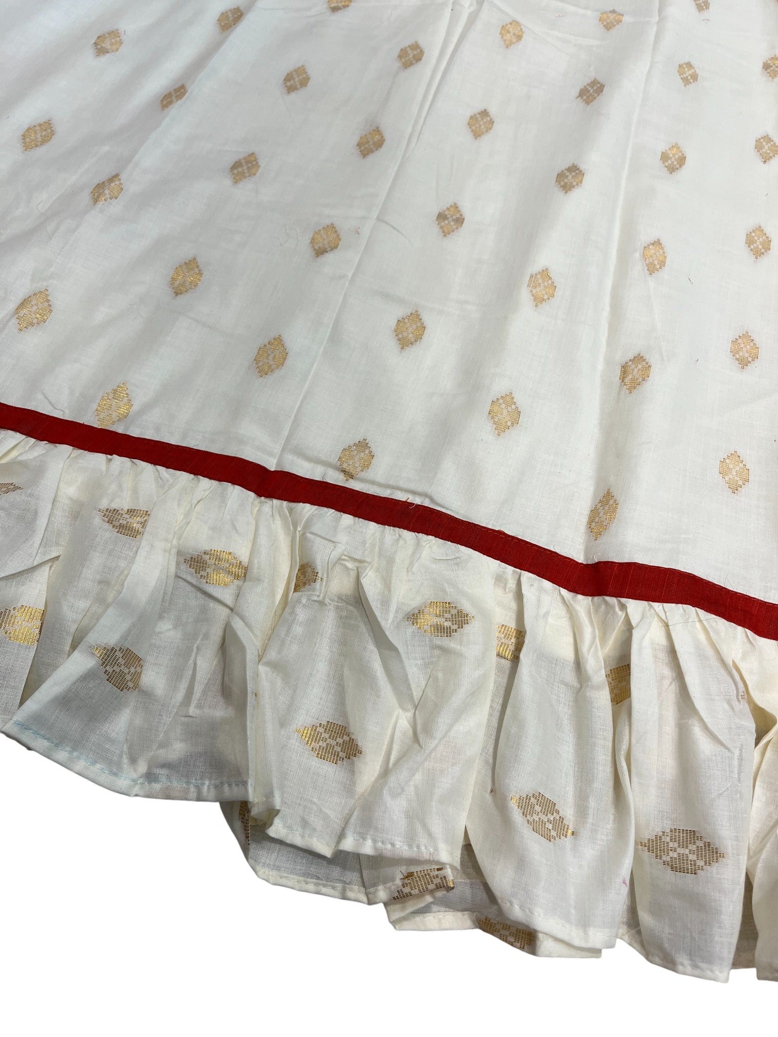 South Indian Dhavani Set is a favourite among girls, particularly during festivities. This particular one is stitched with high quality lining cloth. (Blouse Stitched).