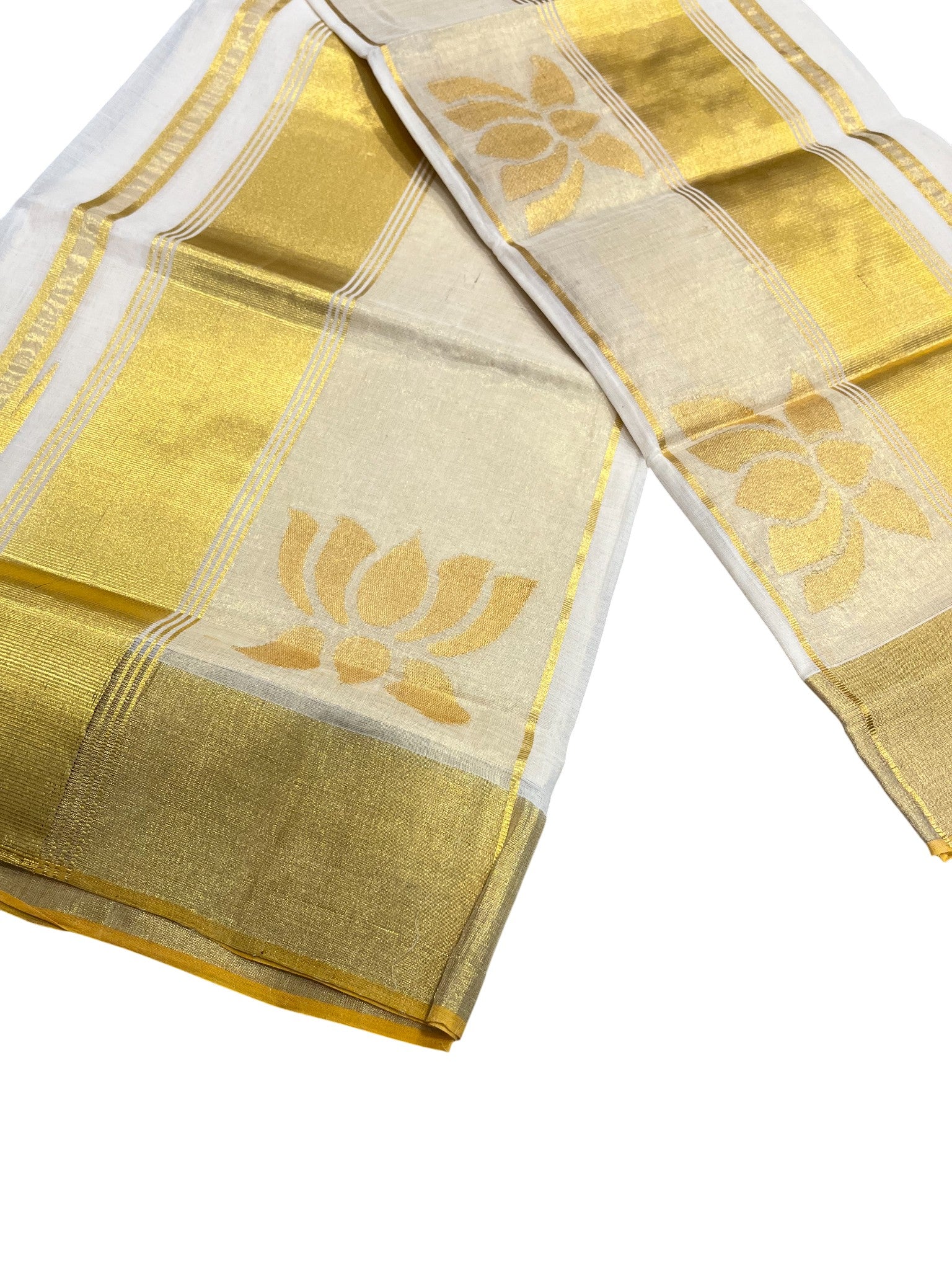 Southloom Super Premium Balaramapuram Handloom Pure Cotton Unakkupaavu Lotus Design Wedding Pudava Set Mundu