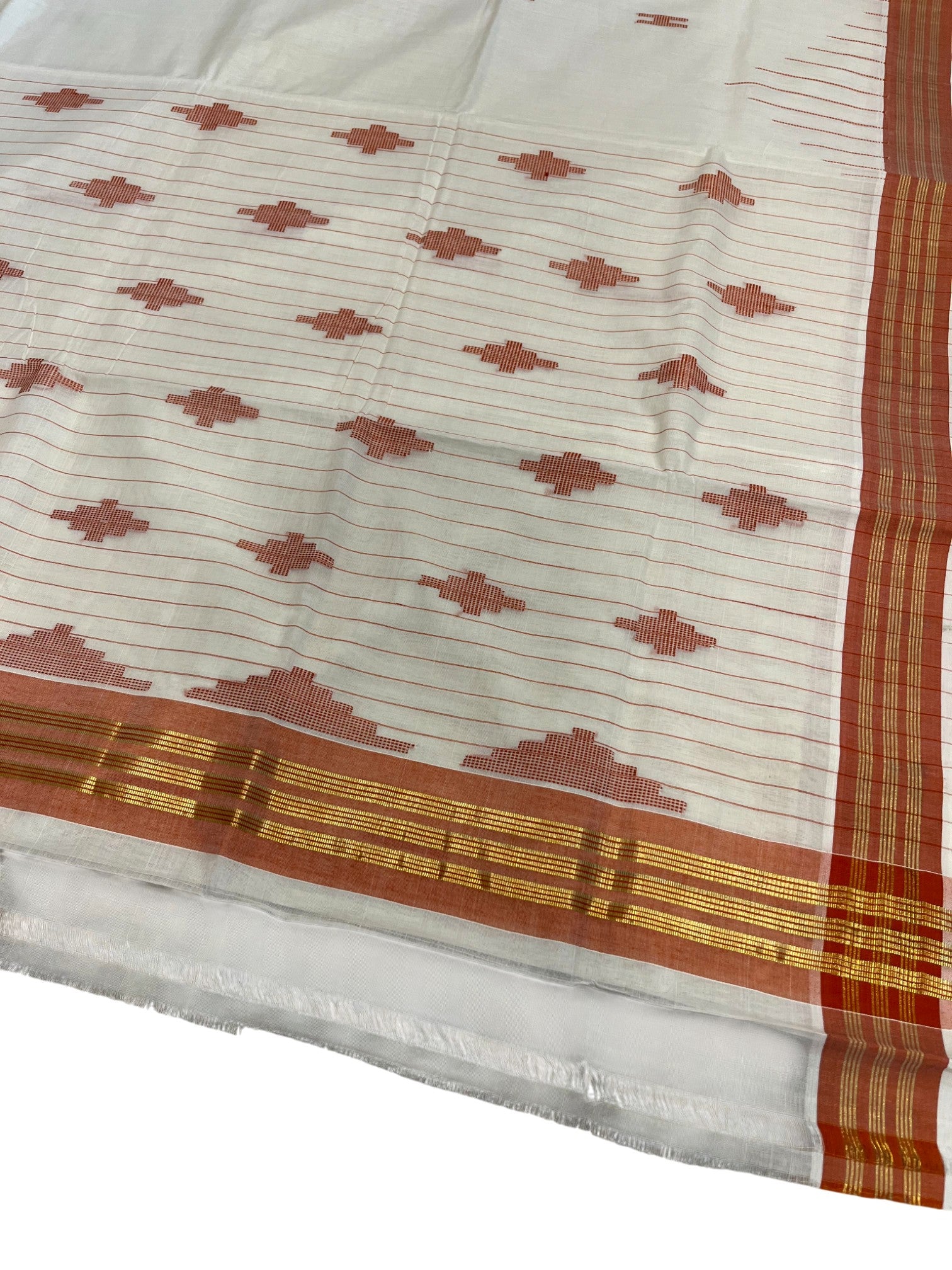 This is an authentic Southloom branded Handloom saree woven by one of our master weavers from Kerala. The village has been renowned throughout centuries for the fine pieces of traditional attire that it churns out.