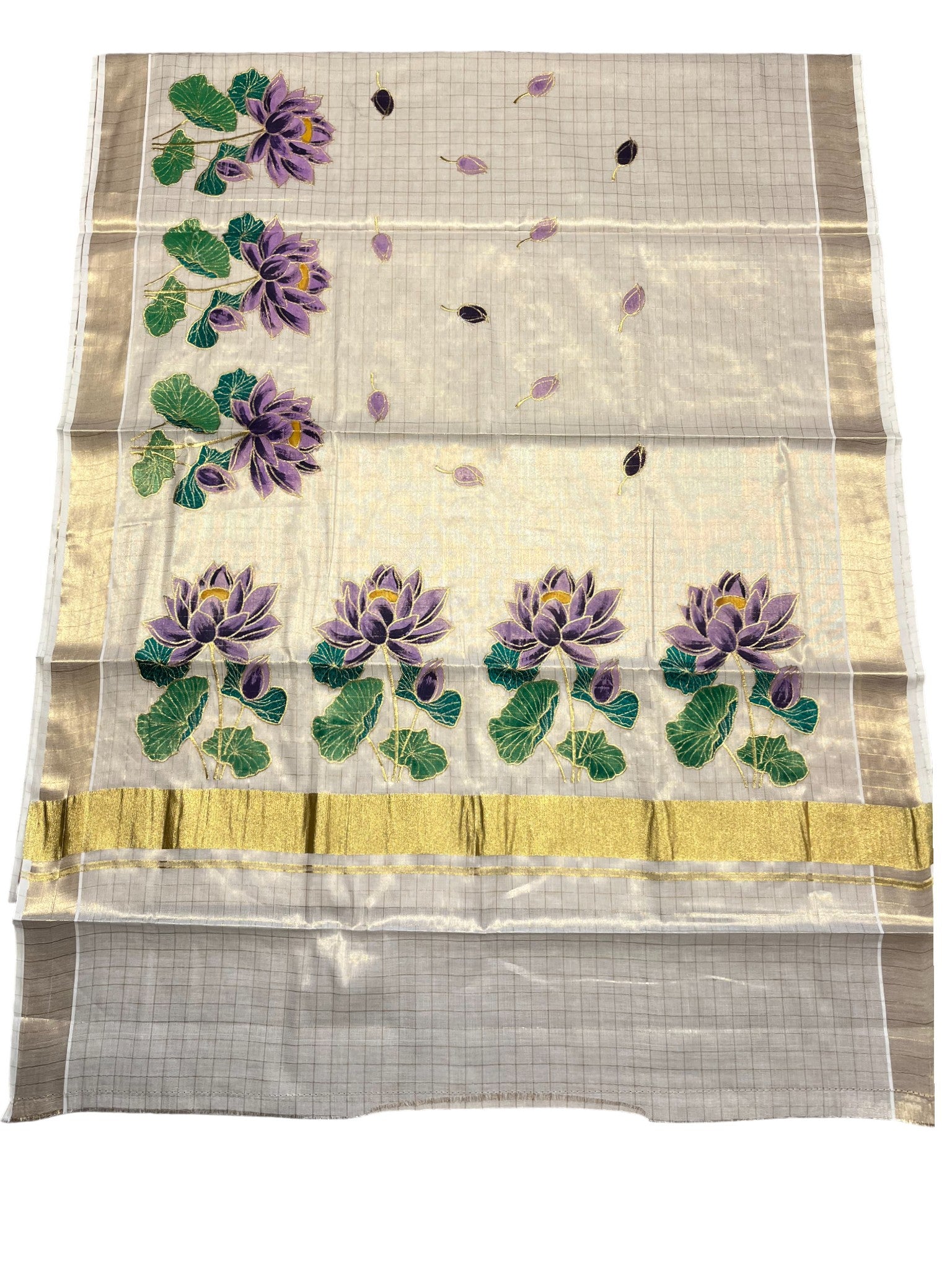 Southloom Tissue Check Kerala Kasavu Saree with Hand Painted Embroidery Violet Lotus Design