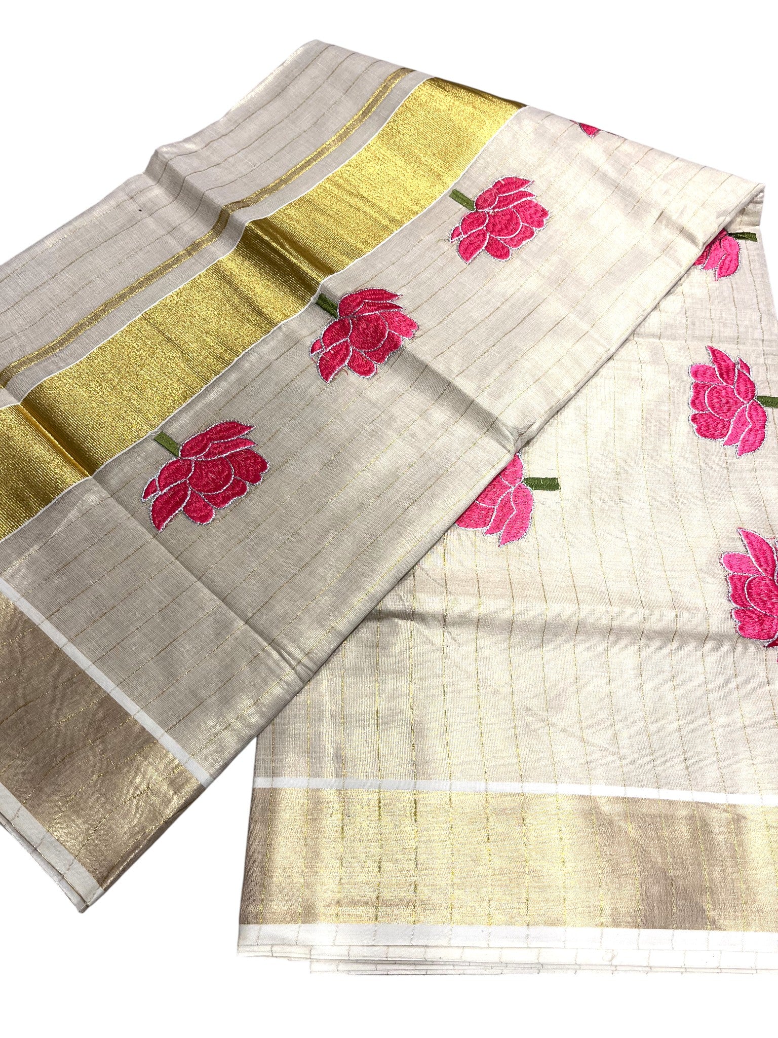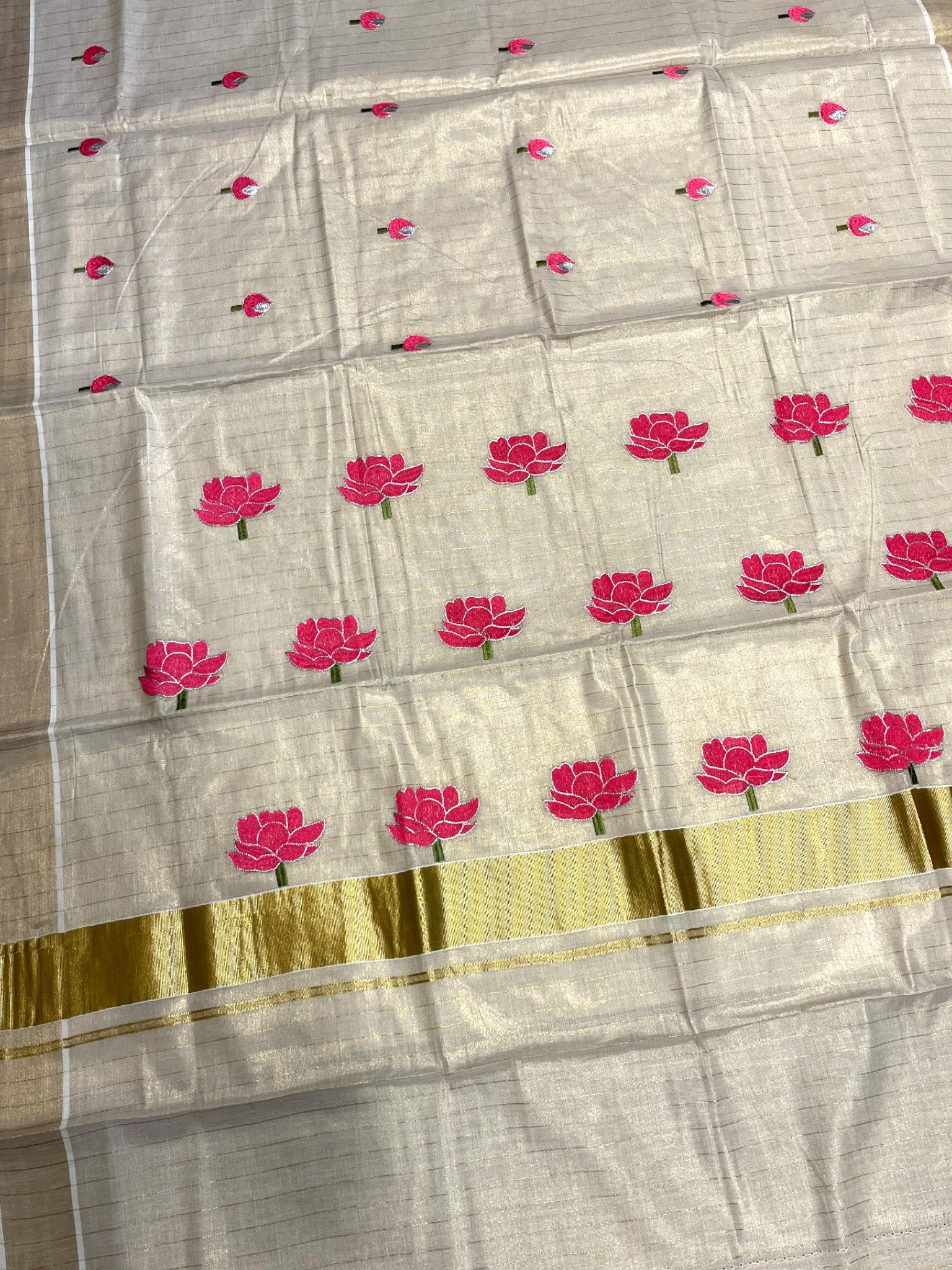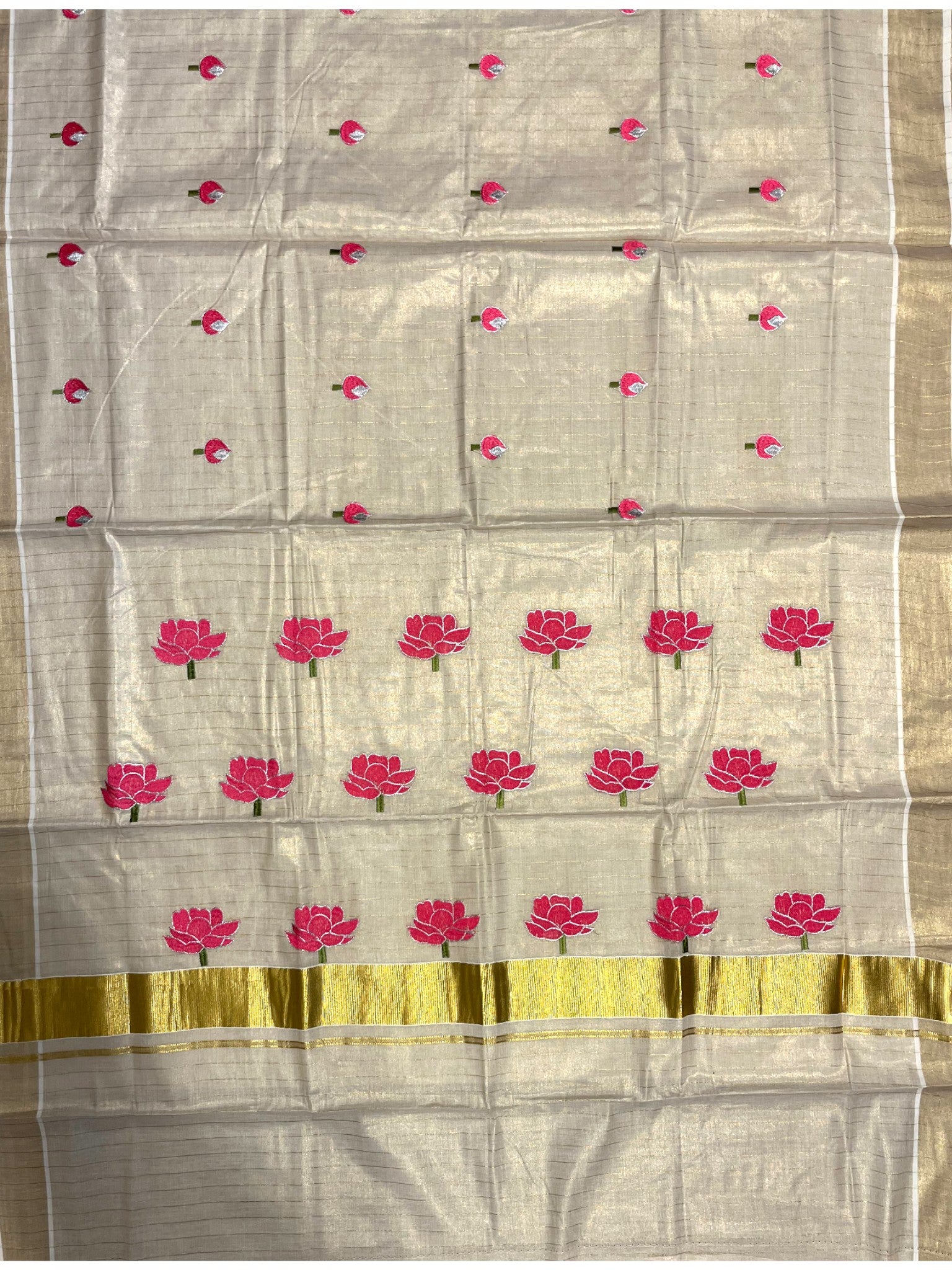 Southloom Tissue Kerala Kasavu Saree with Lotus Embroidery Design