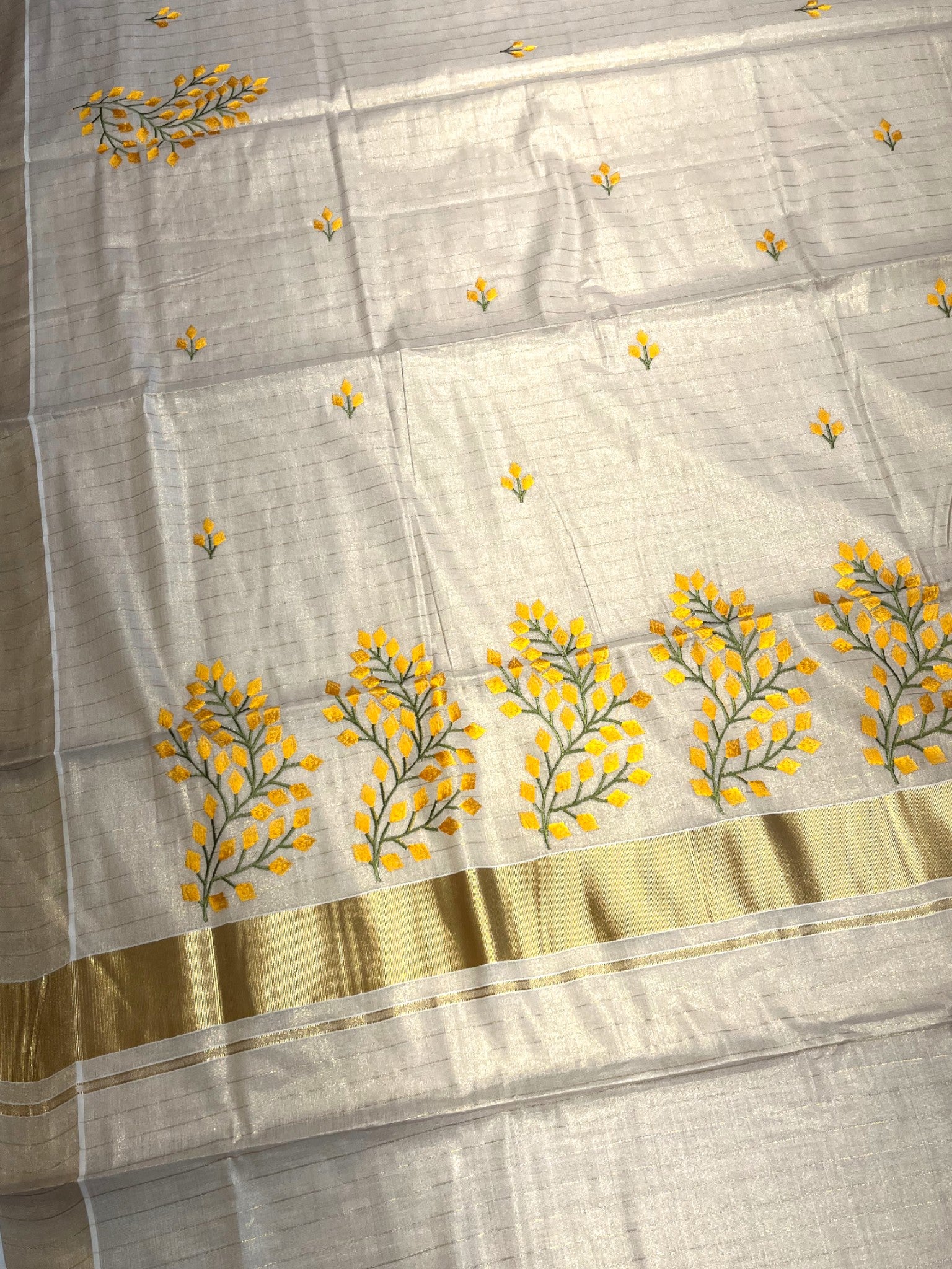 Southloom Tissue Kerala Kasavu Saree with Floral Embroidery Design