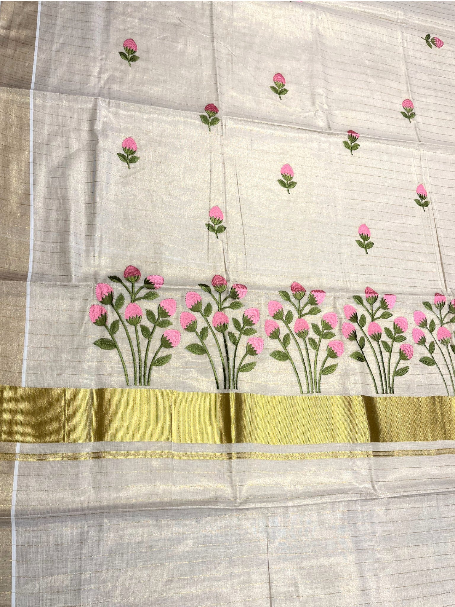 Southloom Tissue Kerala Kasavu Saree with Floral Embroidery Design