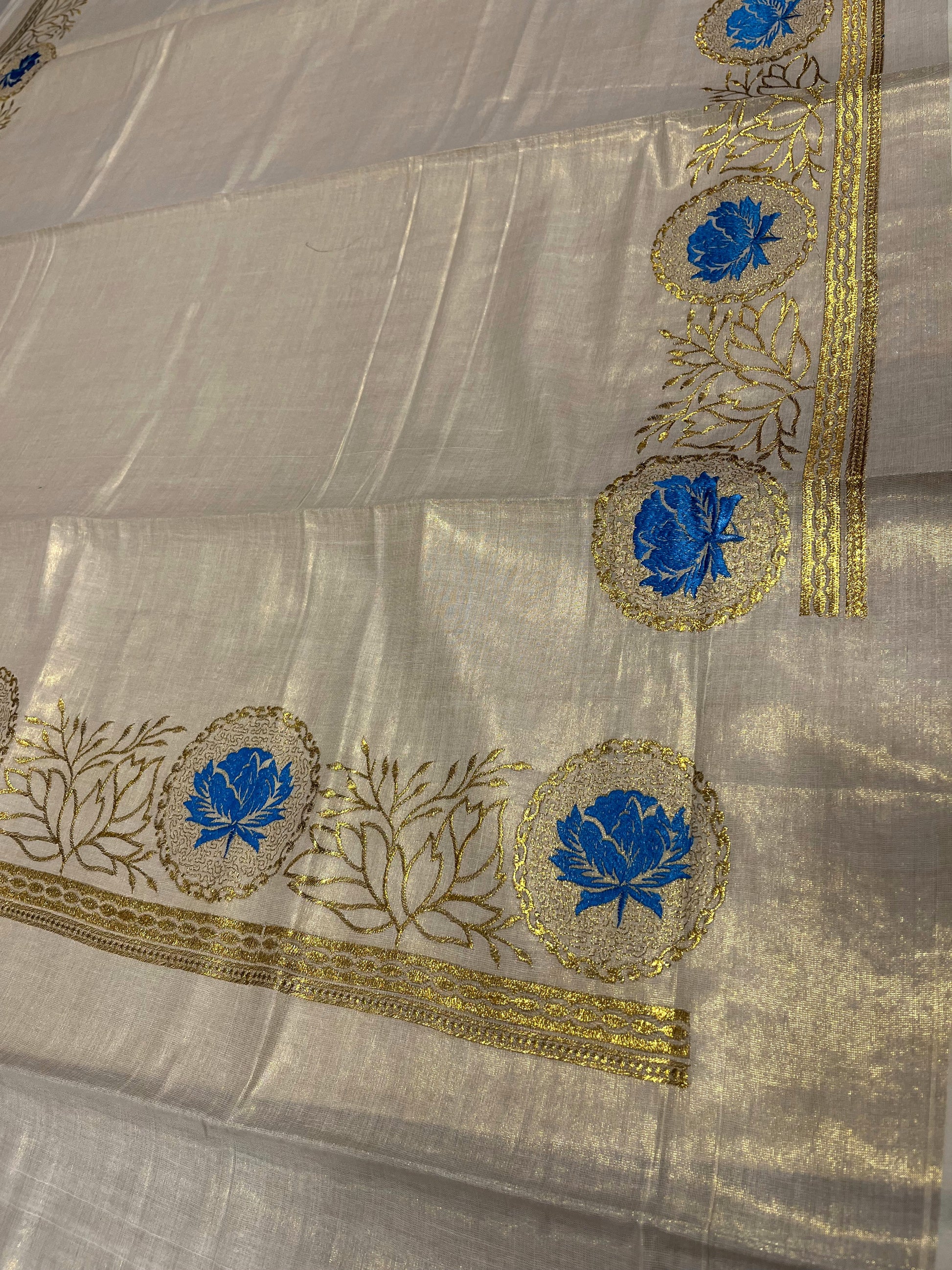 Southloom Tissue Kerala Kasavu Saree with Blue Floral Print on Border