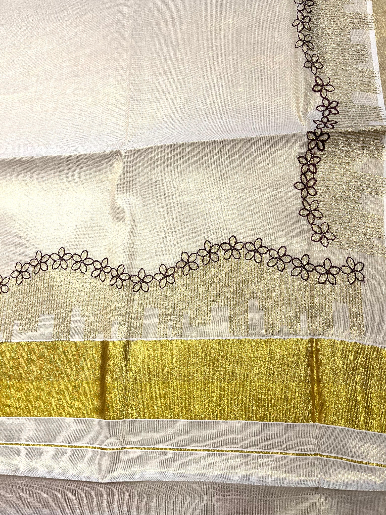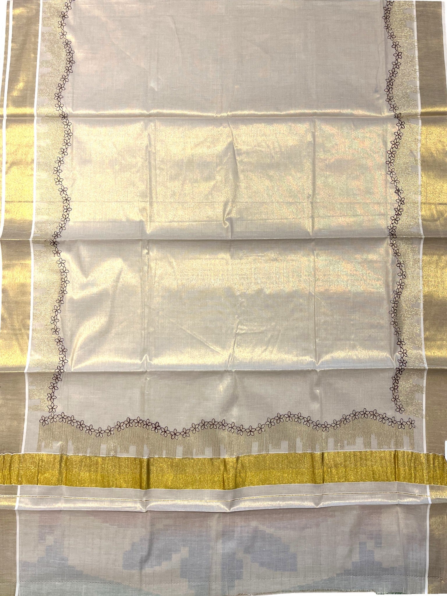 Southloom Tissue Kerala Kasavu Saree with Floral Embroidery Design