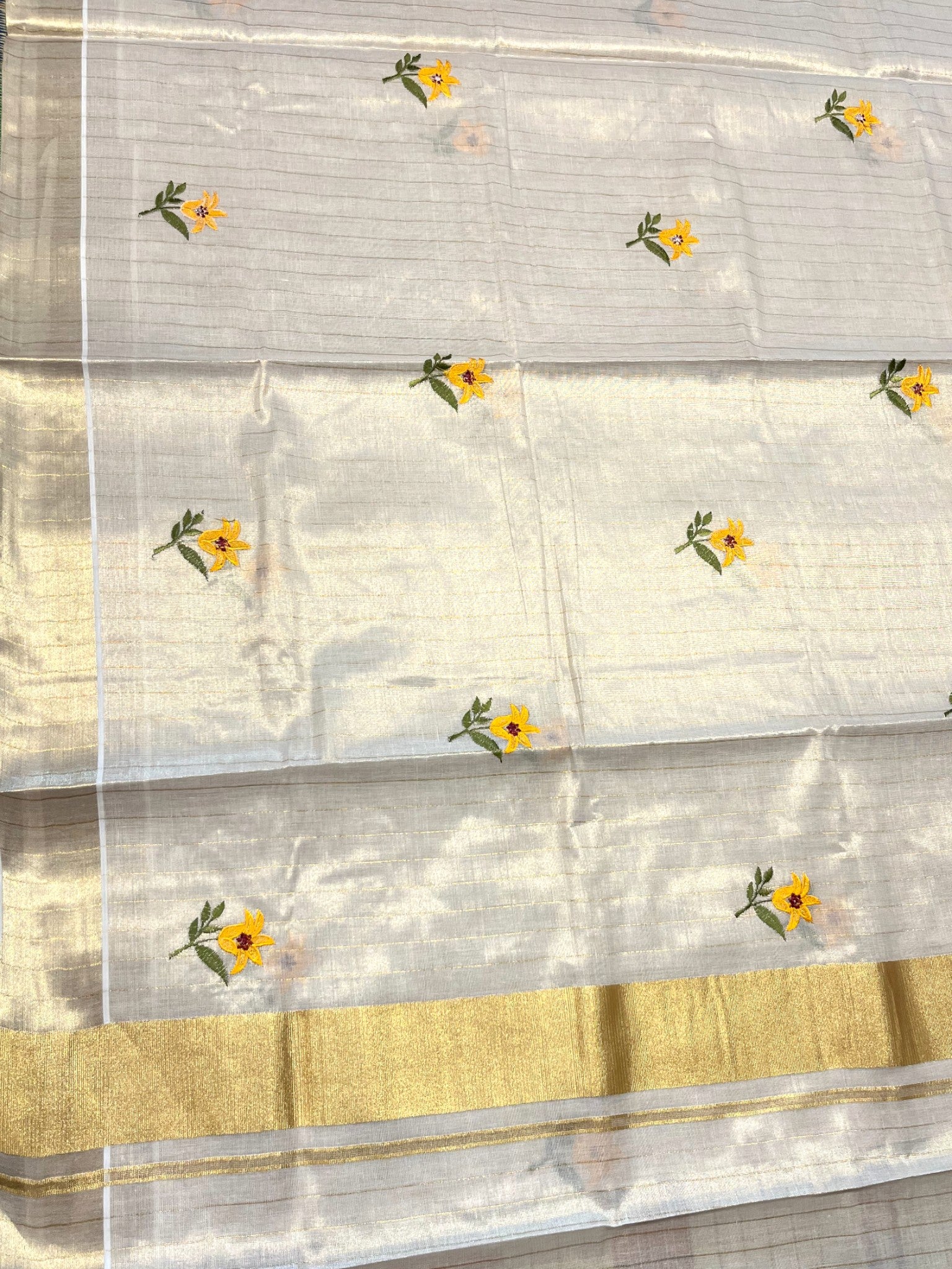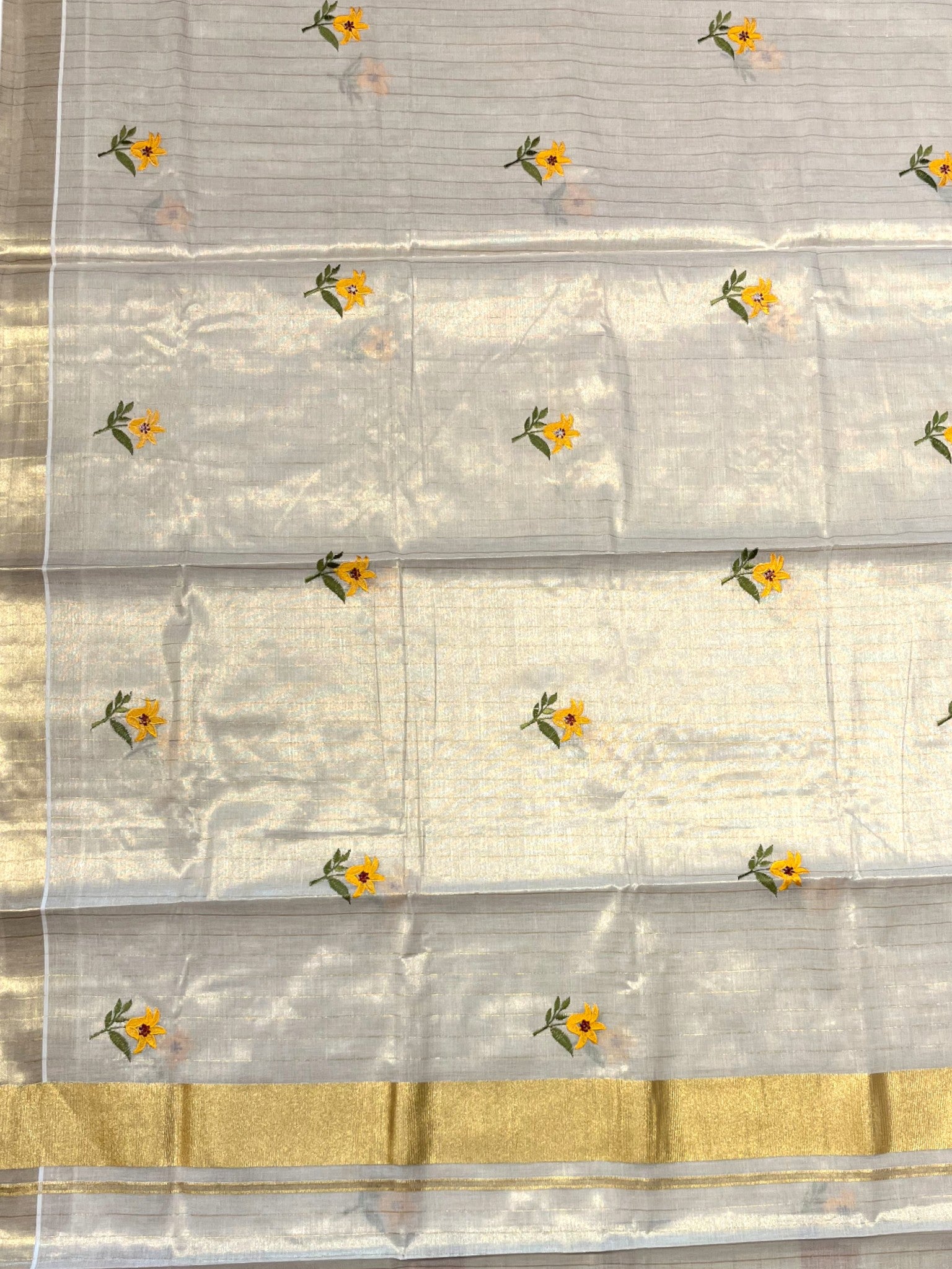 Southloom Tissue Kerala Kasavu Stripes Saree with Yellow Floral Embroidery Design