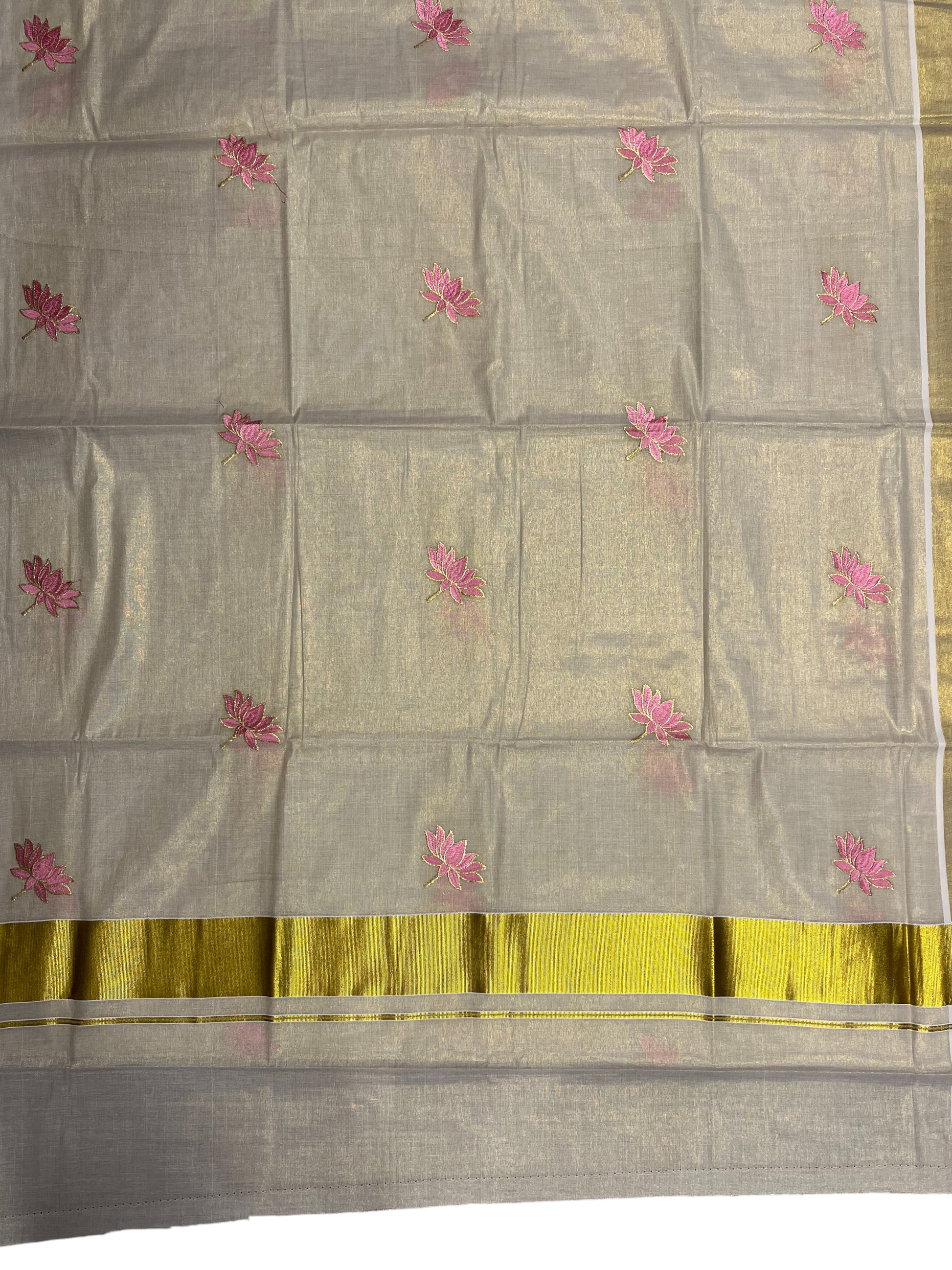 Southloom Tissue Kerala Saree With Lotus Pink and Gold Embroidery