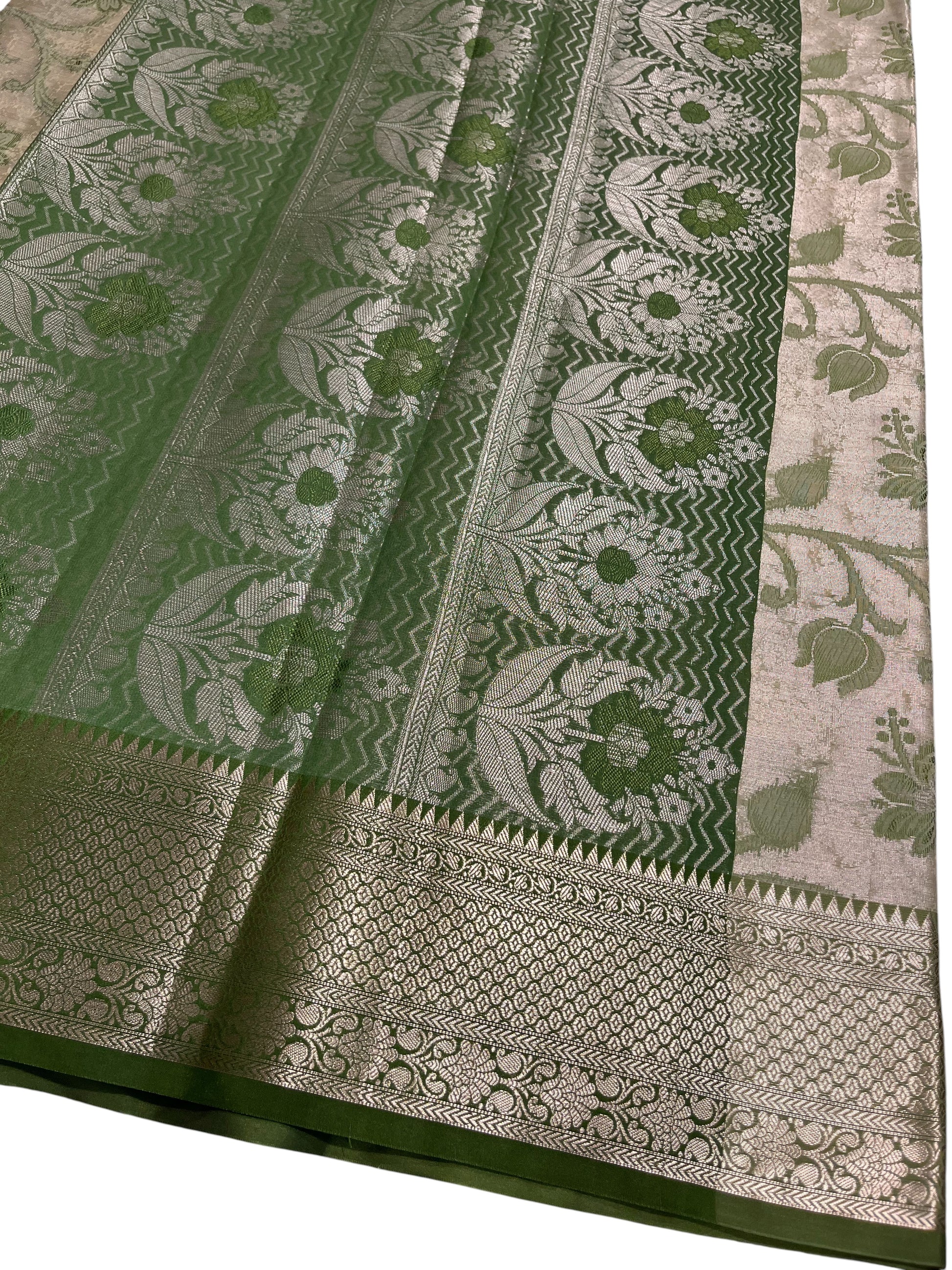Southloom Tissue Silk Saree with Woven Work on Body and Borders (Beige & Green)