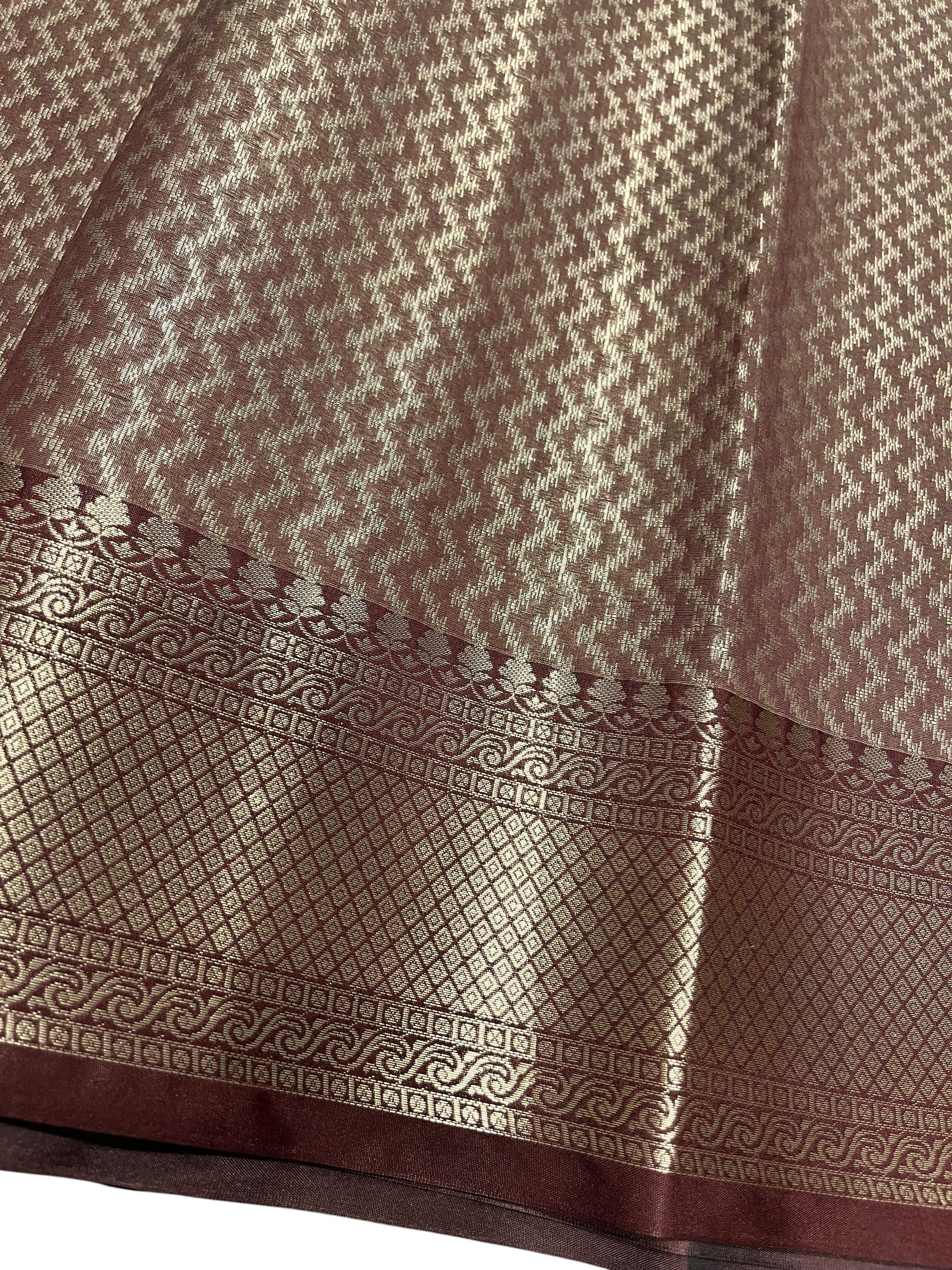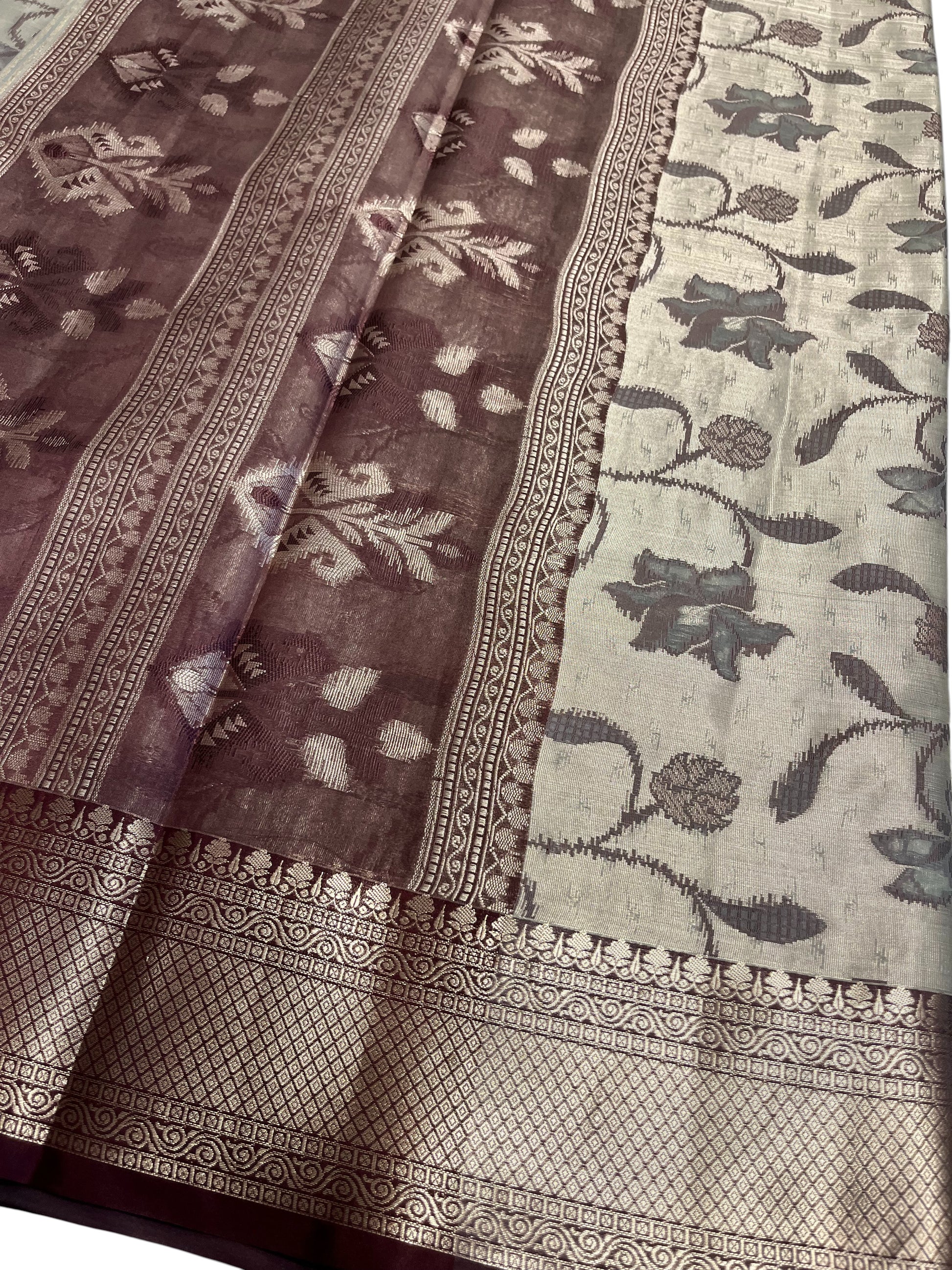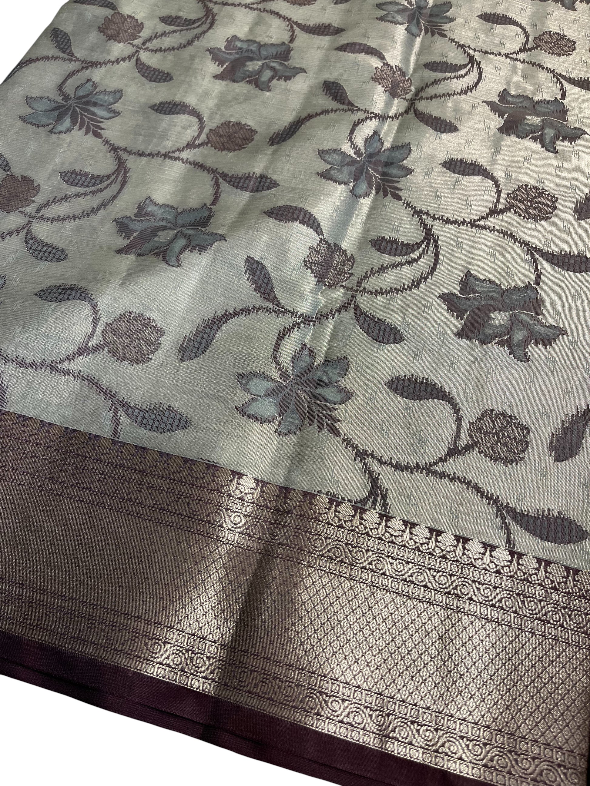 Southloom Tissue Silk Saree with Woven Work on Body and Borders (Grey & Maroon)