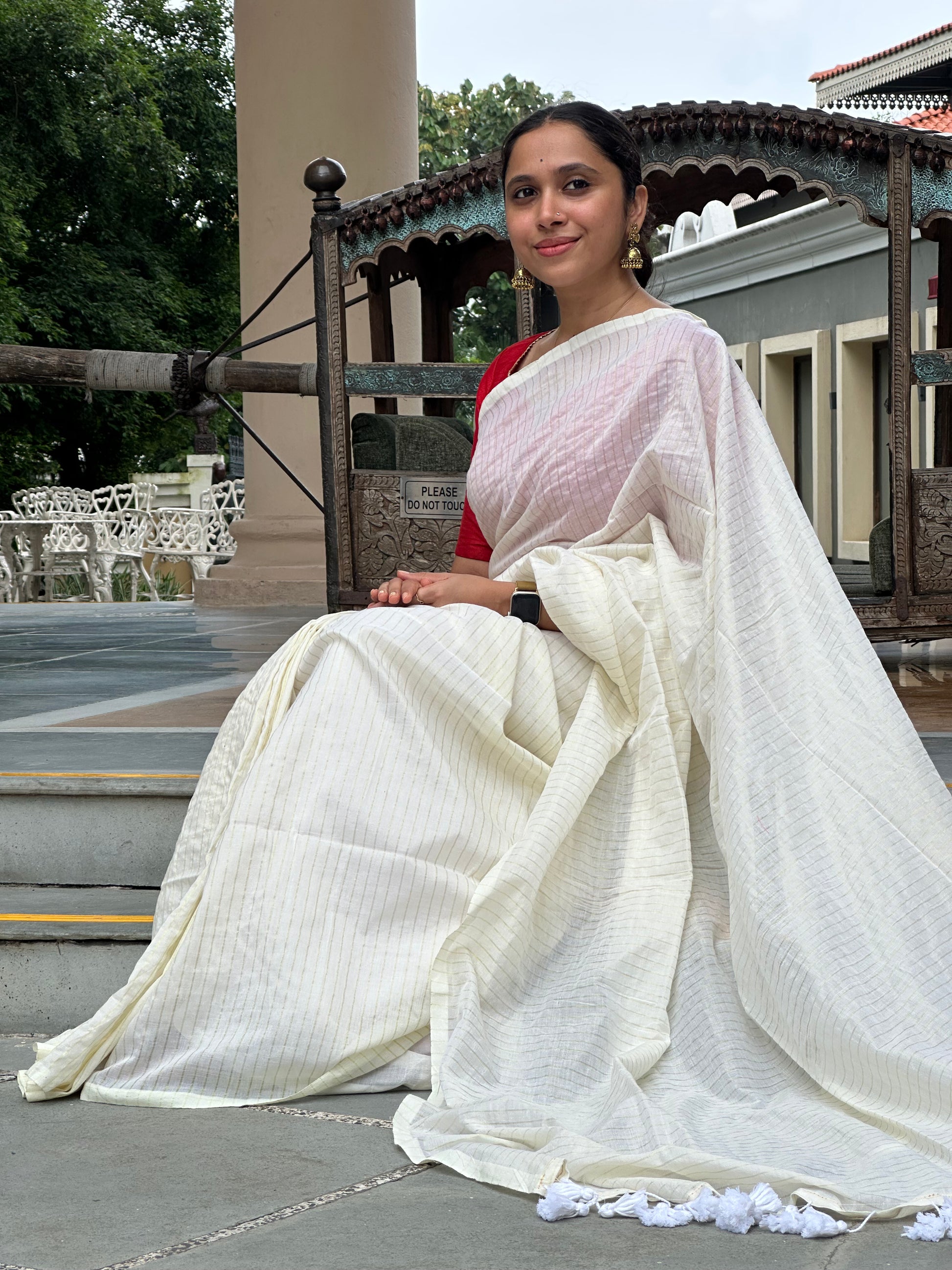 Featuring the classic Kerala saree aesthetic with a golden zari border, this piece blends tradition with understated sophistication. Ideal for both casual wear and festive gatherings, it pairs beautifully with traditional gold jewellery or modern accessories.